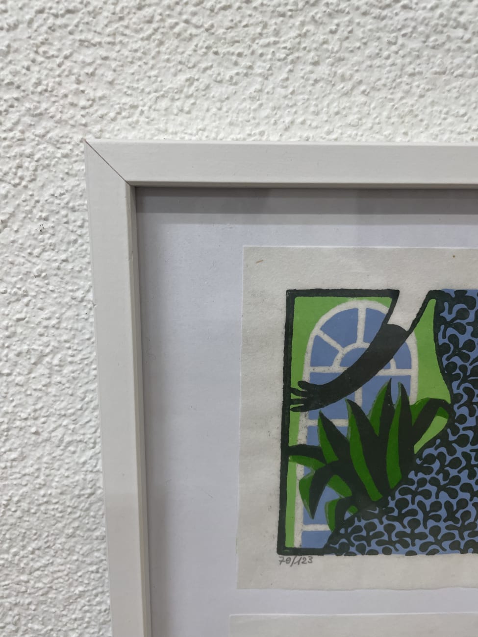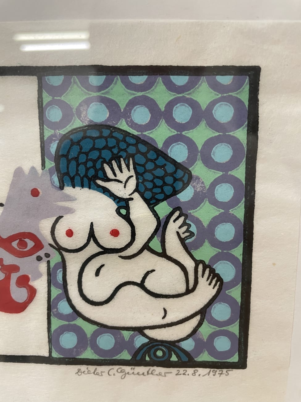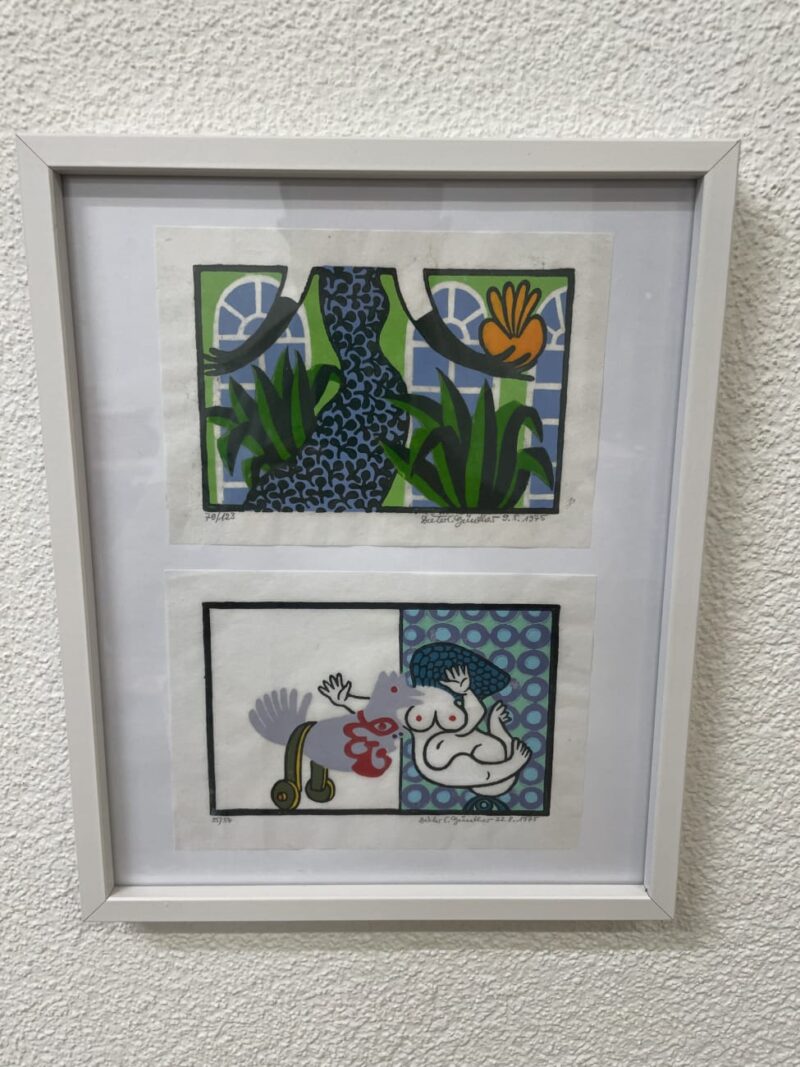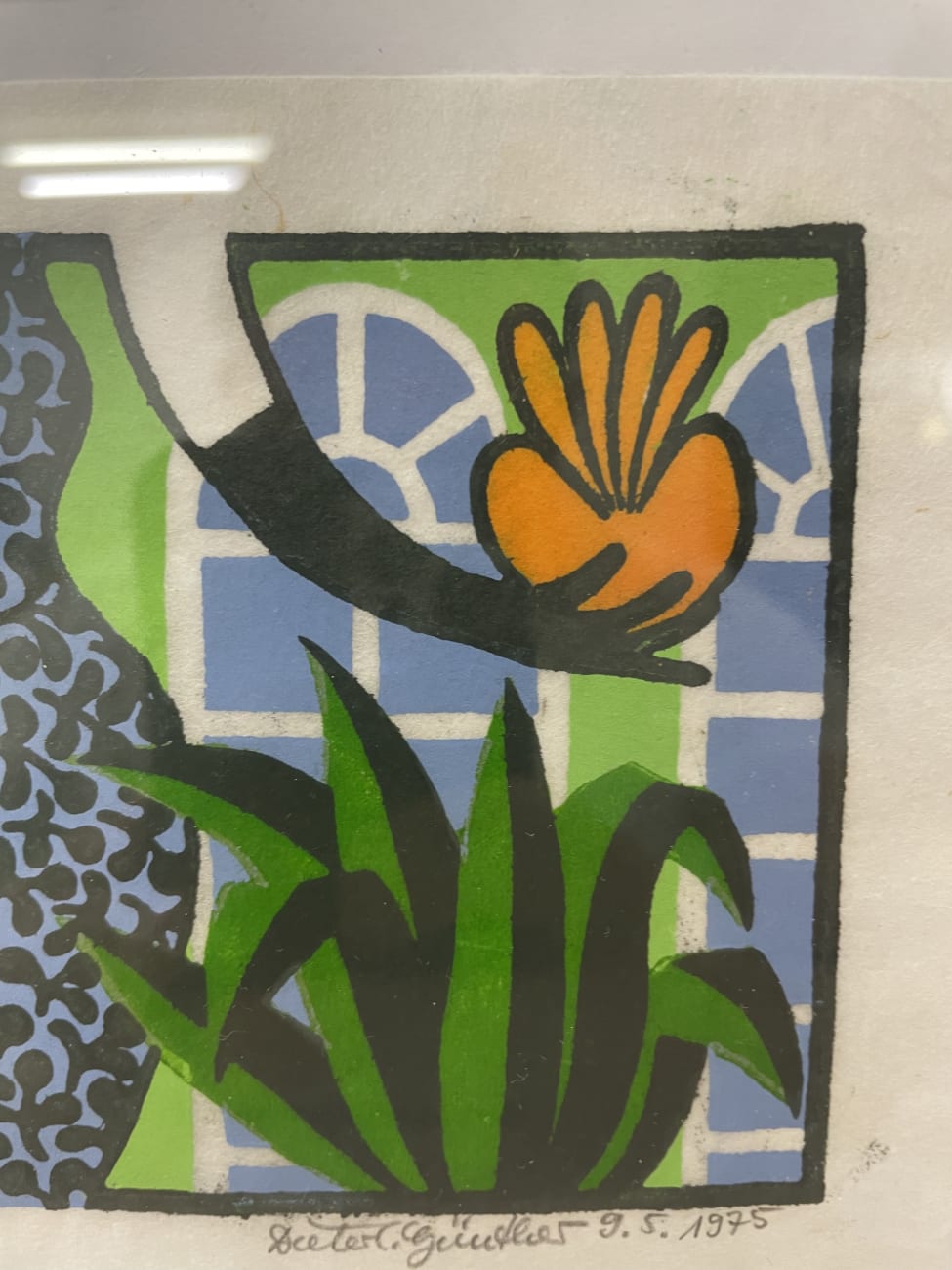 Zwei farbintensive Drucke aus dem Jahr 1975, signiert „Dieter C. Günther“. Klare schwarze Konturen treffen auf kräftige Grün-, Blau- und Orangetöne. Oben eine stilisierte Szene mit Pflanzen, Fensterbögen und abstrahierter Figur, unten eine verspielte, fast provokante Darstellung mit humorvollem Charakter. Beide Blätter sind nummeriert und zeigen typische Merkmale der Pop Art der 1970er Jahre. Zusammen im Rahmen wirken sie lebendig und ziehen sofort den Blick an.
