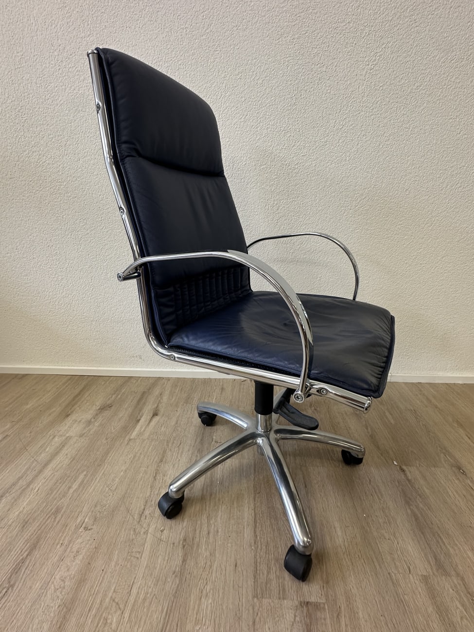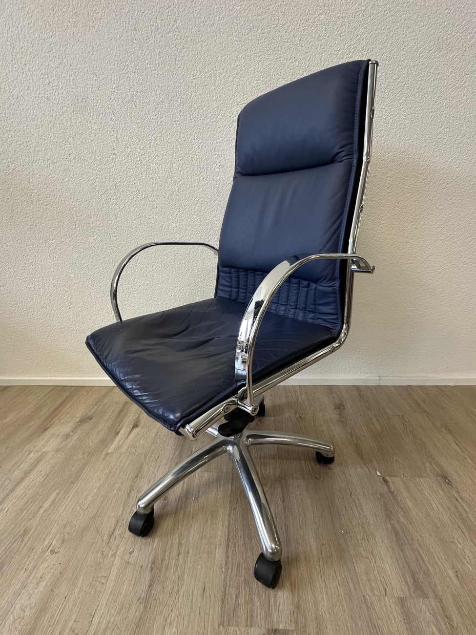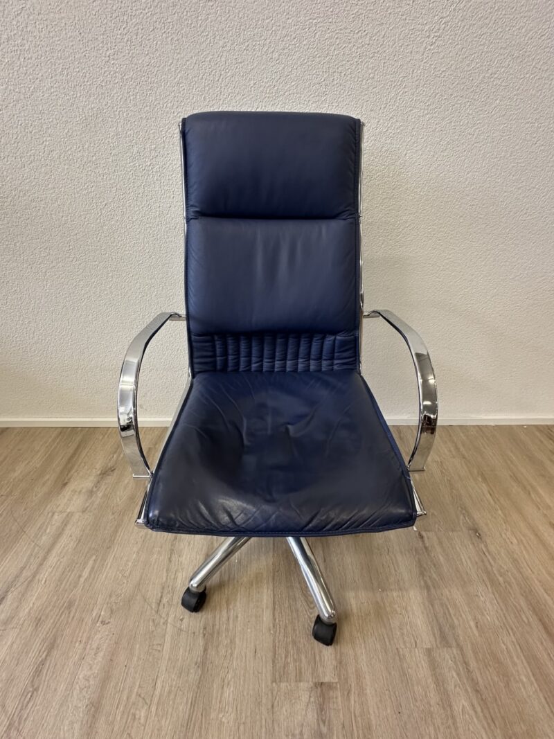 Dunkelblaues Leder, glänzendes Chrom und eine klare Formgebung bringen hier den typischen Postmodern Stil der 1990er Jahre zusammen. Die hohe Rückenlehne wirkt ruhig und geradlinig, während die leicht gepolsterte Sitzfläche für angenehmes Sitzen sorgt. Auffällig sind die geschwungenen Armlehnen aus verchromtem Metall, die dem Stuhl einen eleganten technischen Look geben. Dank Rollenfuss und Drehmechanik eignet sich das Modell gut für den täglichen Einsatz am Schreibtisch. Ein Stück, das funktional ist und gleichzeitig visuell etwas hergibt.