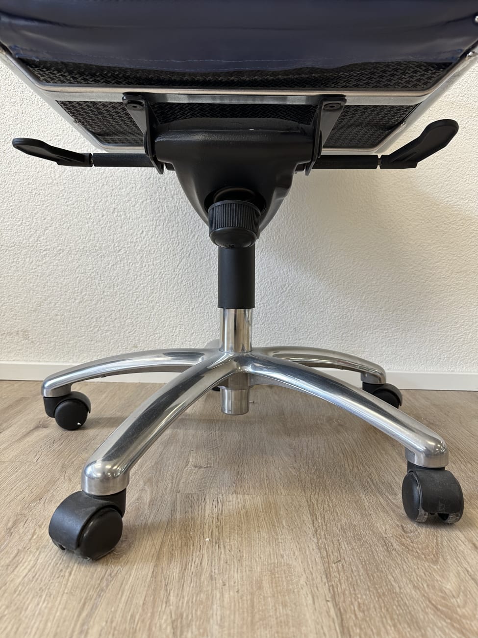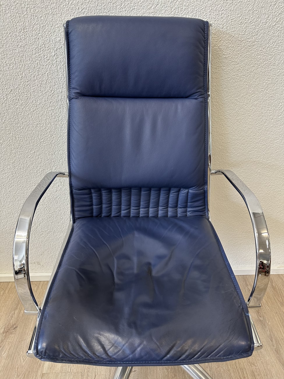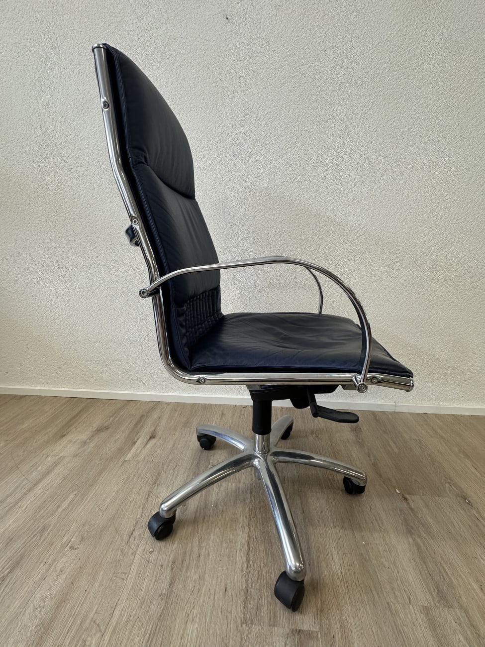 Dunkelblaues Leder, glänzendes Chrom und eine klare Formgebung bringen hier den typischen Postmodern Stil der 1990er Jahre zusammen. Die hohe Rückenlehne wirkt ruhig und geradlinig, während die leicht gepolsterte Sitzfläche für angenehmes Sitzen sorgt. Auffällig sind die geschwungenen Armlehnen aus verchromtem Metall, die dem Stuhl einen eleganten technischen Look geben. Dank Rollenfuss und Drehmechanik eignet sich das Modell gut für den täglichen Einsatz am Schreibtisch. Ein Stück, das funktional ist und gleichzeitig visuell etwas hergibt.
