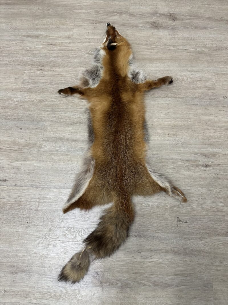 Kräftige Rotbraun- und Grautöne fallen sofort ins Auge. Dieses Vintage Rotfuchs-Fell stammt aus dem Jagd- und Dekobereich der 1970er Jahre und zeigt die typische Farbverteilung mit hellem Bauch und dunkler Rückenlinie. Der buschige Schweif ist vollständig erhalten und wirkt besonders dekorativ. Die Fellstruktur ist dicht und weich, ideal für rustikale Wohnstile oder als markantes Einzelstück. Rückseite naturbelassen gegerbt mit sichtbarer Lederstruktur.