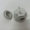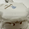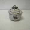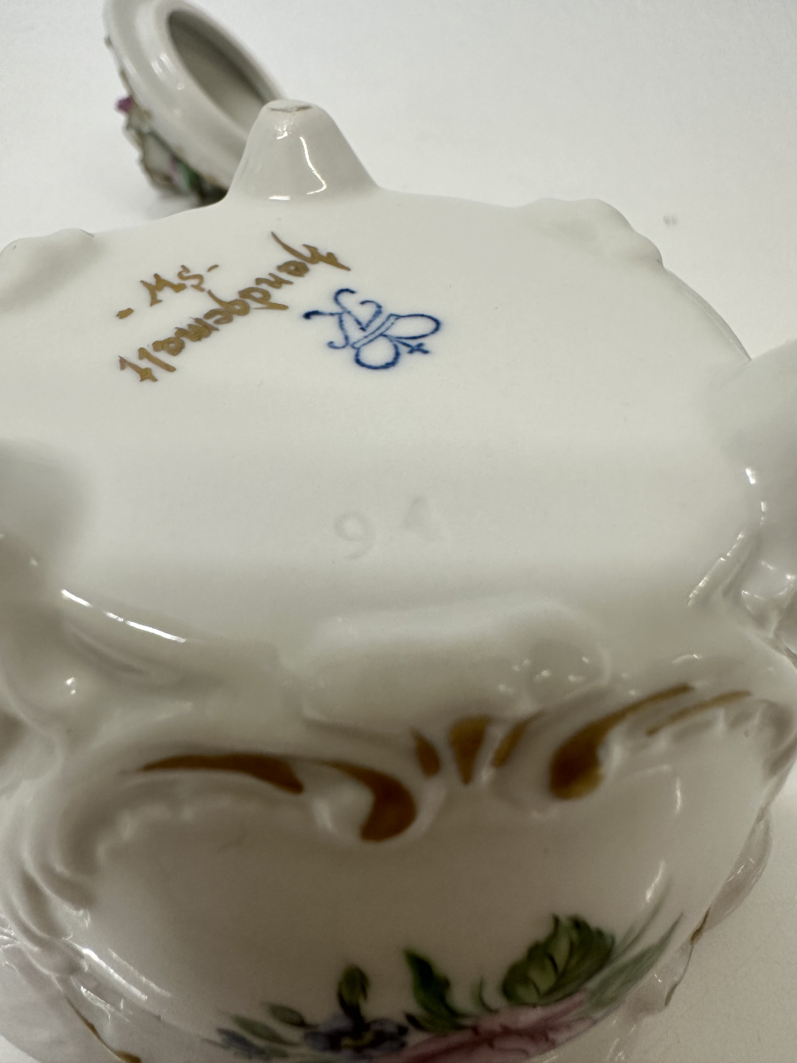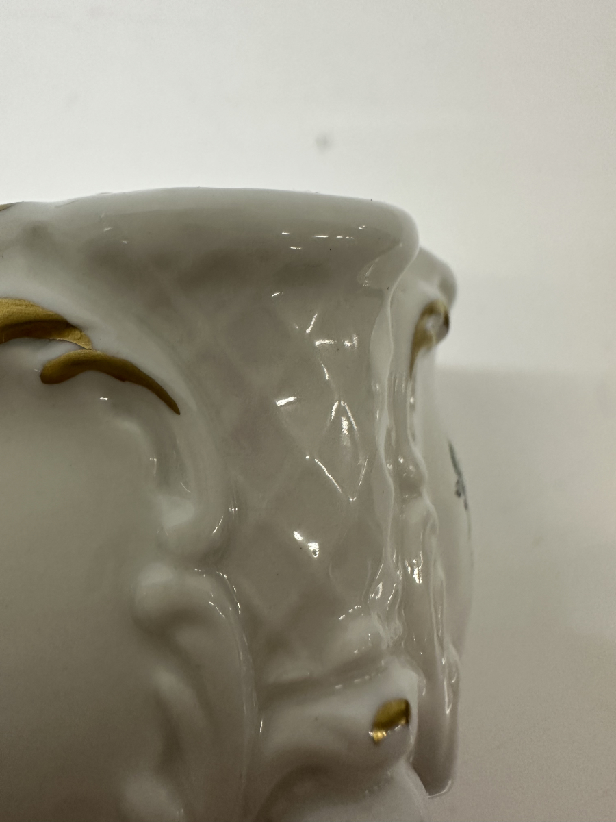 Weiss glasiertes Porzellan mit üppiger Formgebung, goldbetonten Ornamenten und fein handgemalter Rosendekoration. Diese Deckeldose wird durch die plastische Rosenknospe auf dem Deckel geprägt, ergänzt von zarten Knospen und grünen Blättern. Die geschwungene Wandung, kleine Standfüsse und die goldenen Akzente verweisen klar auf eine barocke Stilrichtung. Auf der Unterseite findet sich die handschriftliche Markierung „handgemalt RW“, zugeordnet zu Rudolf Kämmer.