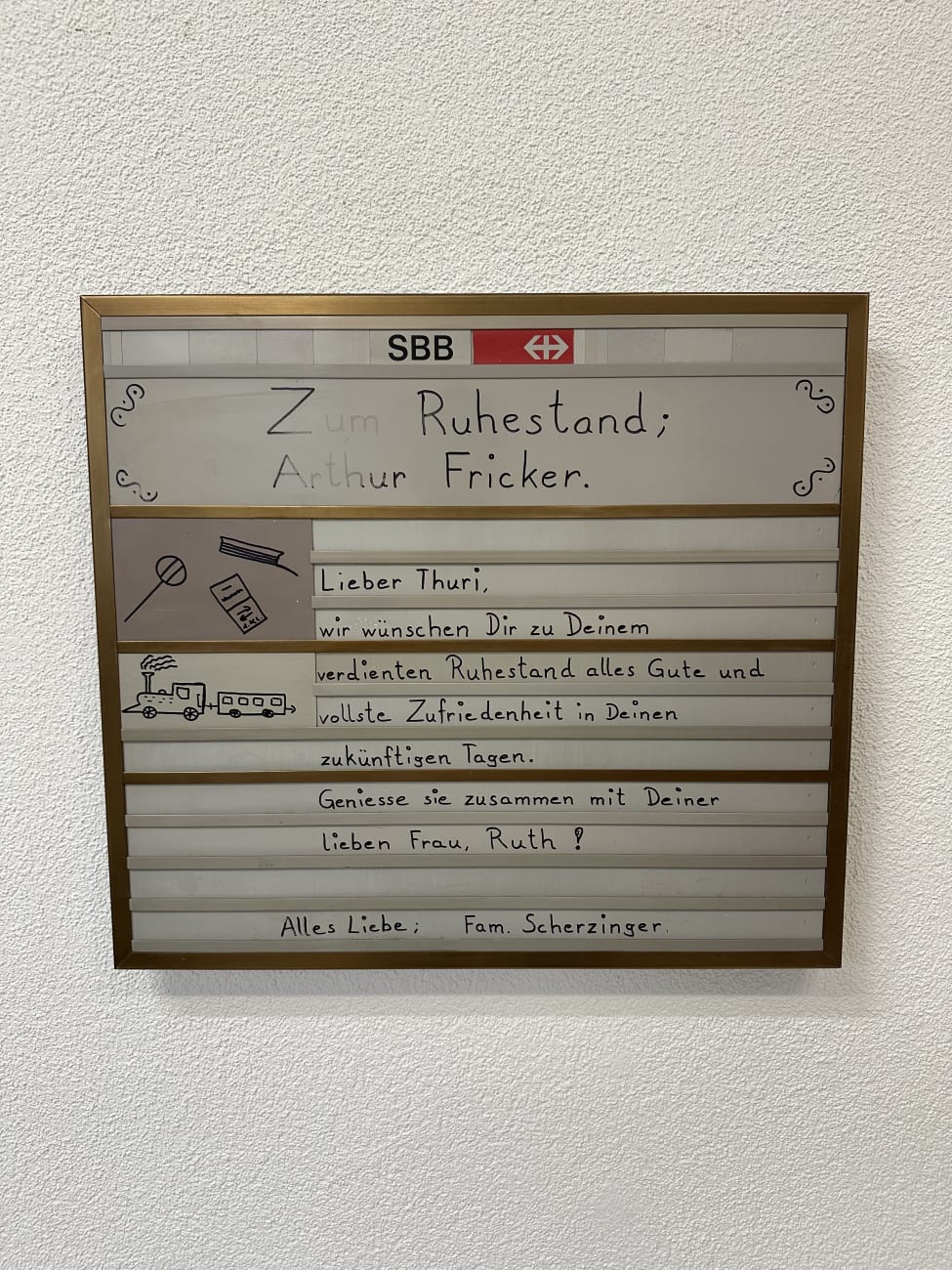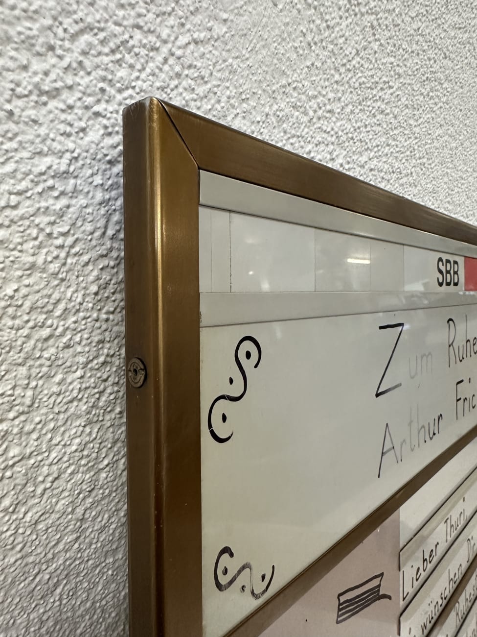 Der stabile Aluminiumrahmen in goldfarbener Ausführung fasst die Kunststofffläche mit den charakteristischen Einschubschienen. Das SBB Logo im oberen Bereich macht die Tafel sofort erkennbar und verleiht ihr einen authentischen Bahncharakter. Heute eignet sich dieses Stück besonders gut als dekoratives Sammlerobjekt oder als funktionale Mitteilungstafel mit Geschichte.