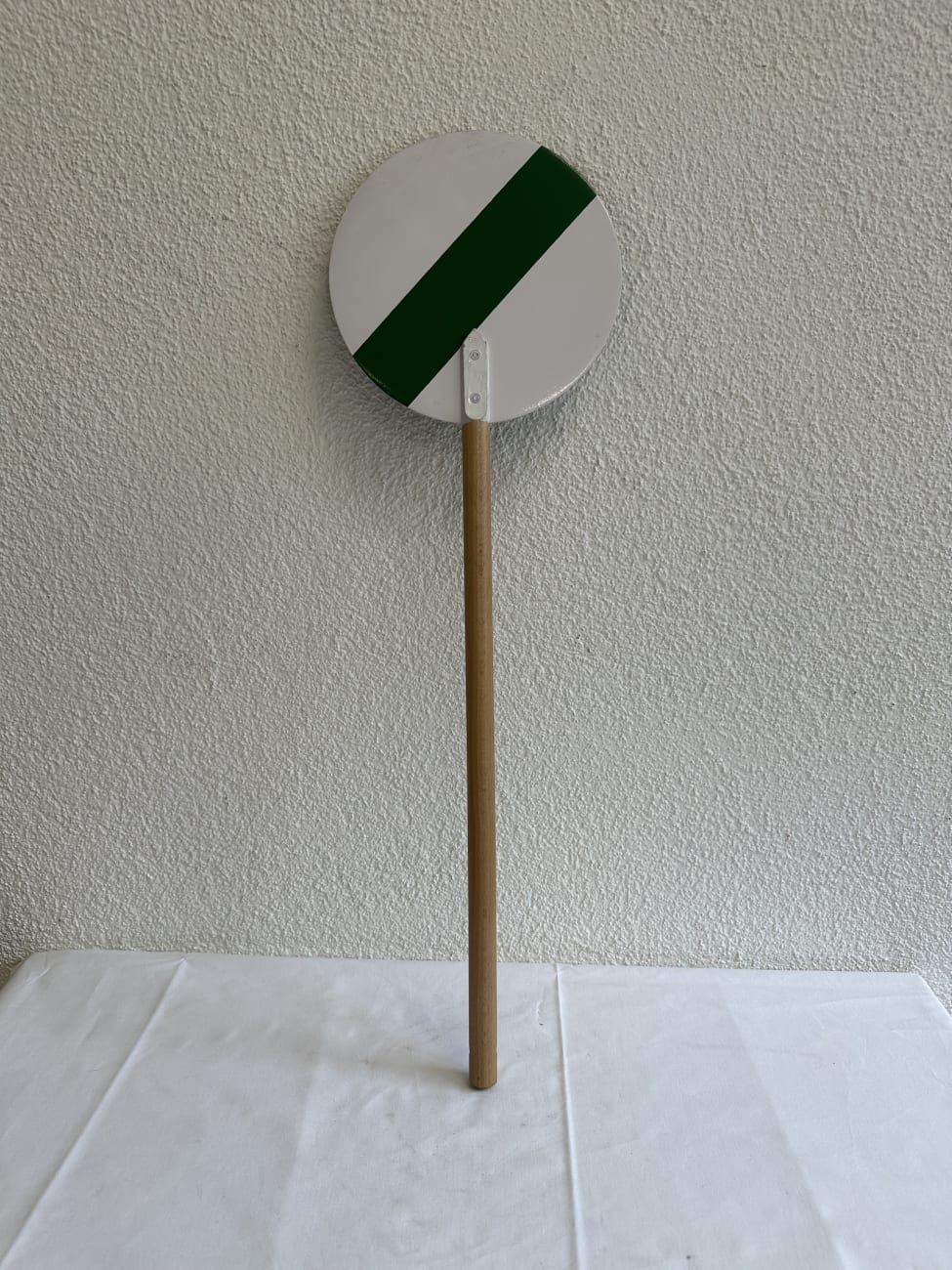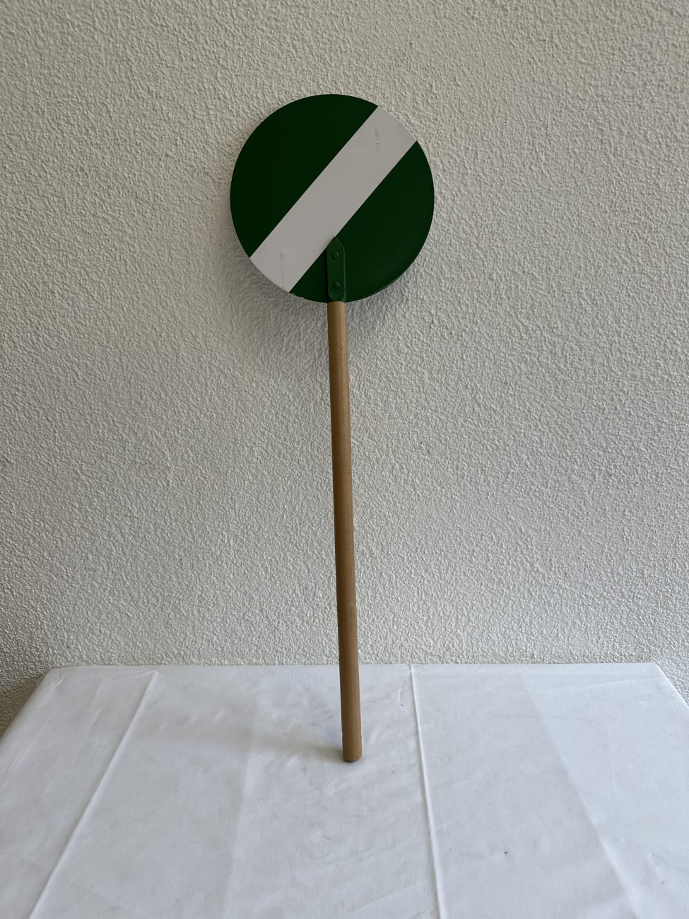 Holzgriff sauber gedrechselt, angenehm in der Hand und mit praktischer Bohrung zum Aufhängen. Die runde Scheibe zeigt die typische grün-weisse Schrägmarkierung, wie sie bei der SBB im Rangier- und Signalbetrieb eingesetzt wurde. Die Verbindung ist stabil verschraubt und wirkt funktional gebaut. Solche Kellen dienten zur visuellen Signalgebung auf Bahnhöfen und im Rangierbereich. Die klare Farbaufteilung sorgt für sofortige Erkennbarkeit. Heute wirkt das Stück ruhig, reduziert und bringt einen authentischen Bezug zur Schweizer Bahngeschichte mit.