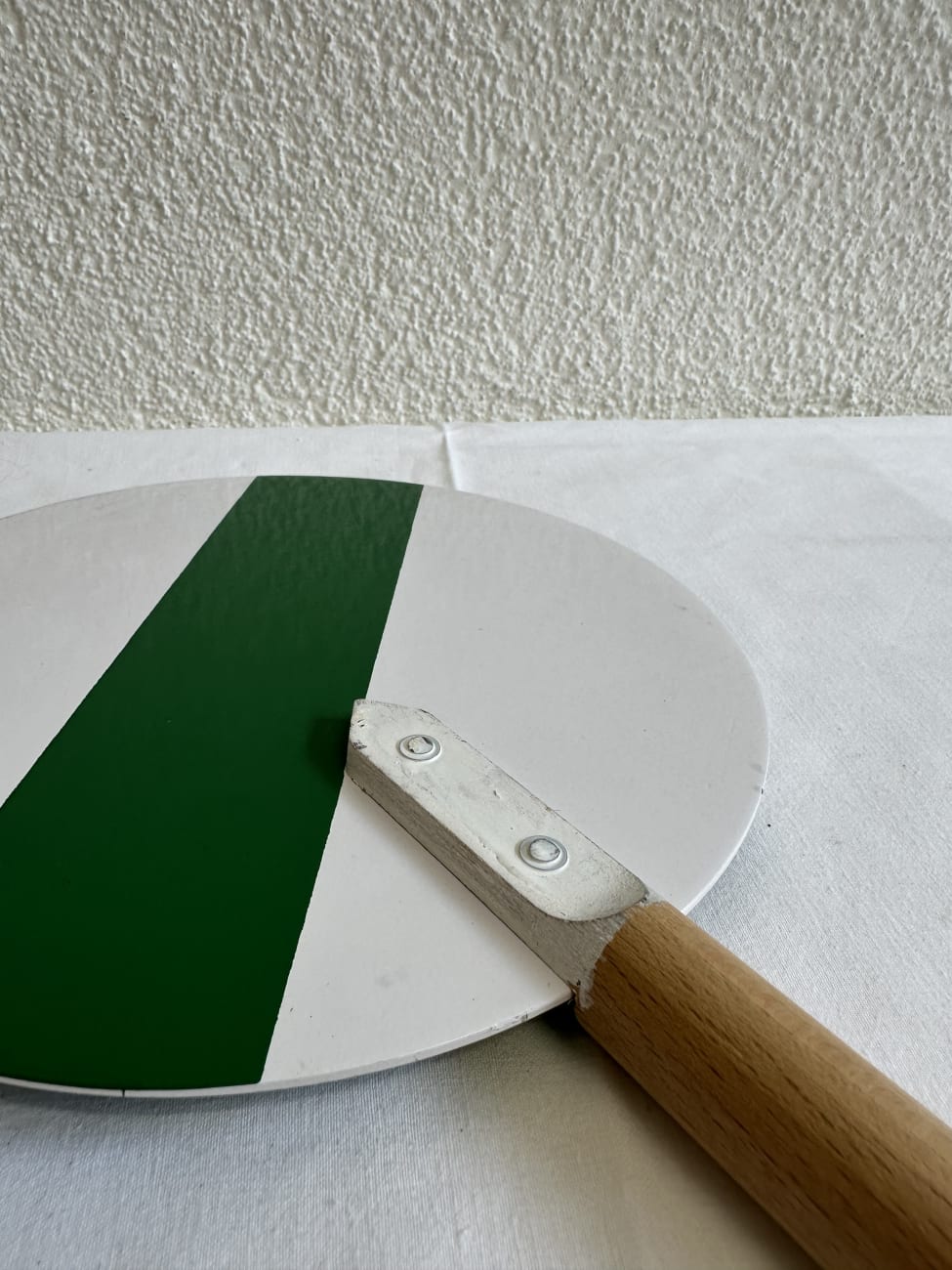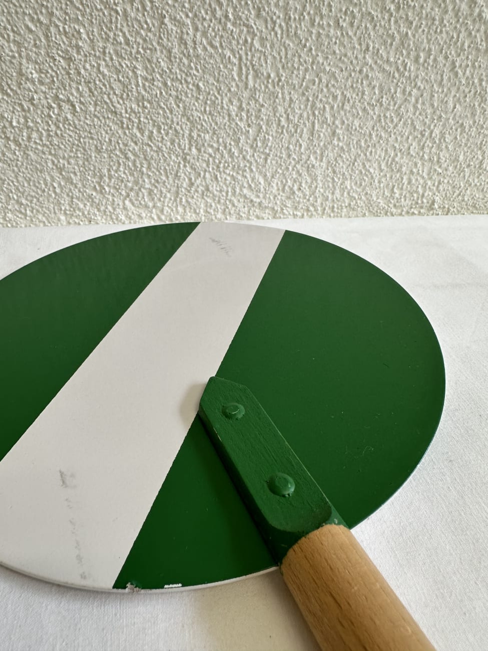 ✅ Material: Holzgriff (vermutlich Buche), lackierte Holzscheibe, Metallhalterung