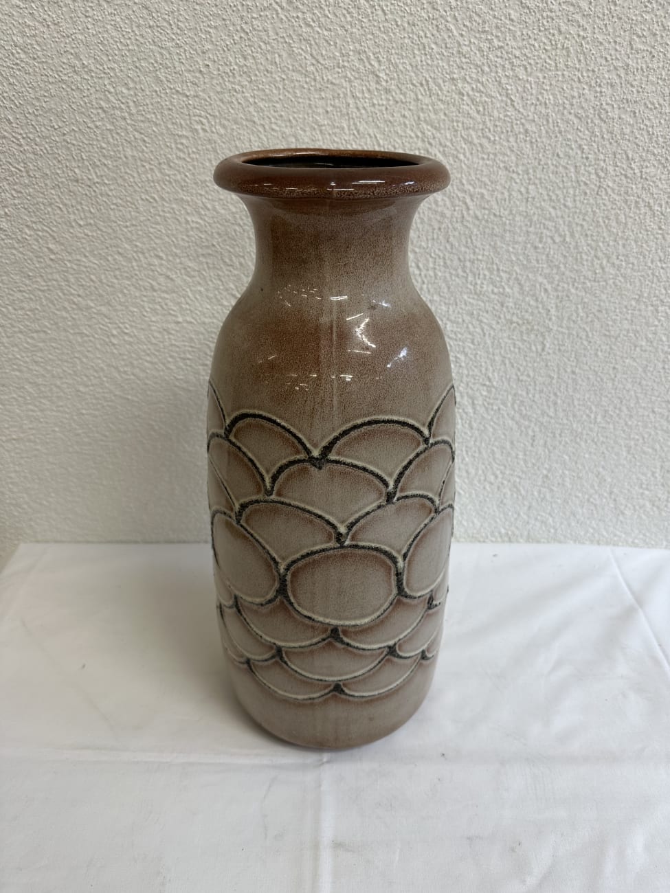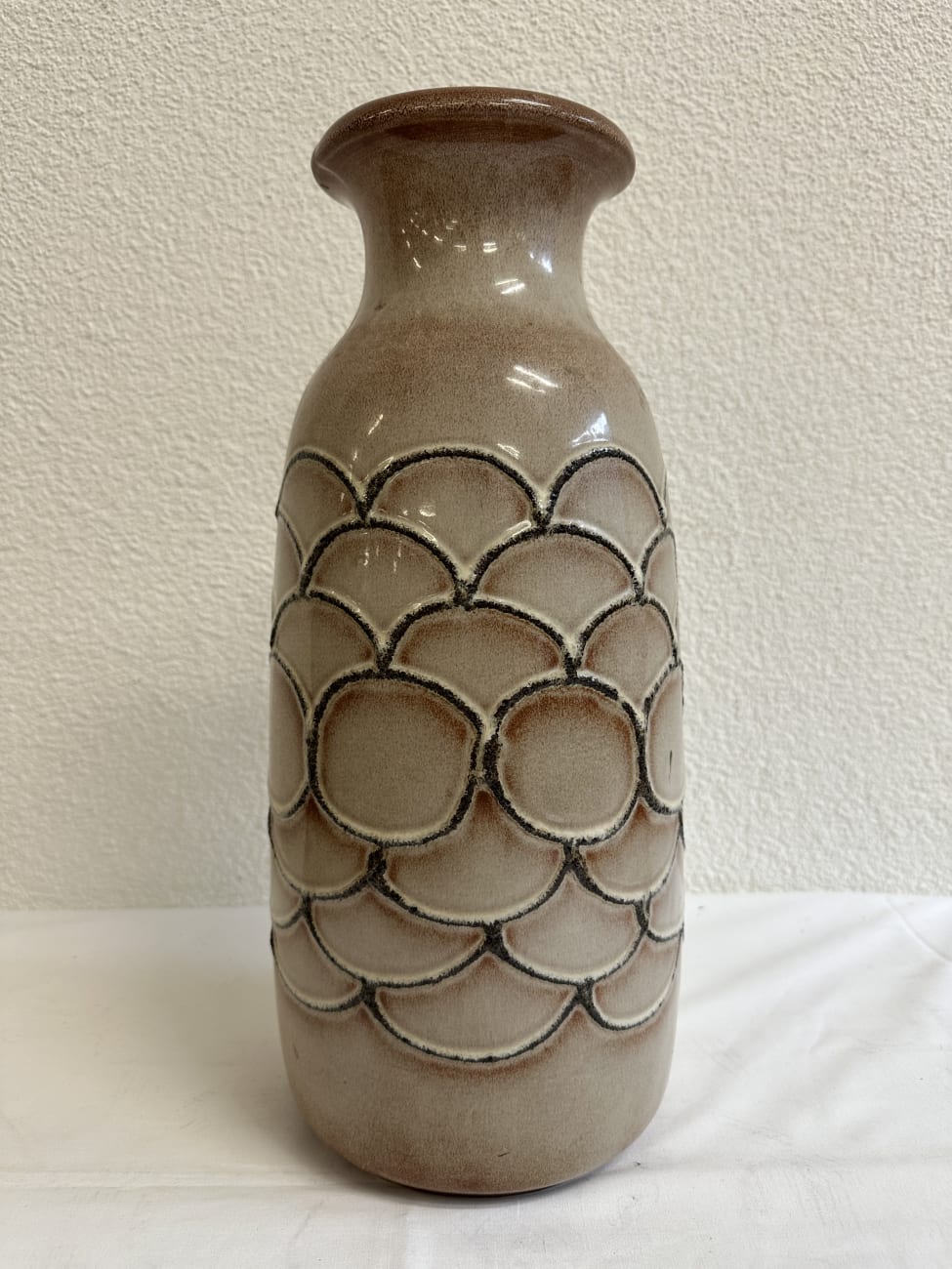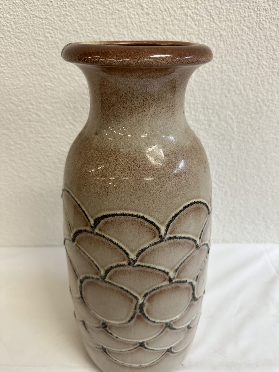 Diese Vintage Keramikvase von Scheurich aus West Germany stammt aus den 1970er Jahren und zeigt ein dekoratives Relief aus übereinanderliegenden, schuppenartigen Formen. Die beige bis braune Verlaufsglasur mit dunklen Konturen betont das plastische Muster und verleiht der Oberfläche Tiefe. Solche Modelle gehörten zu den typischen Exportkeramiken der deutschen Studiokeramik dieser Zeit.