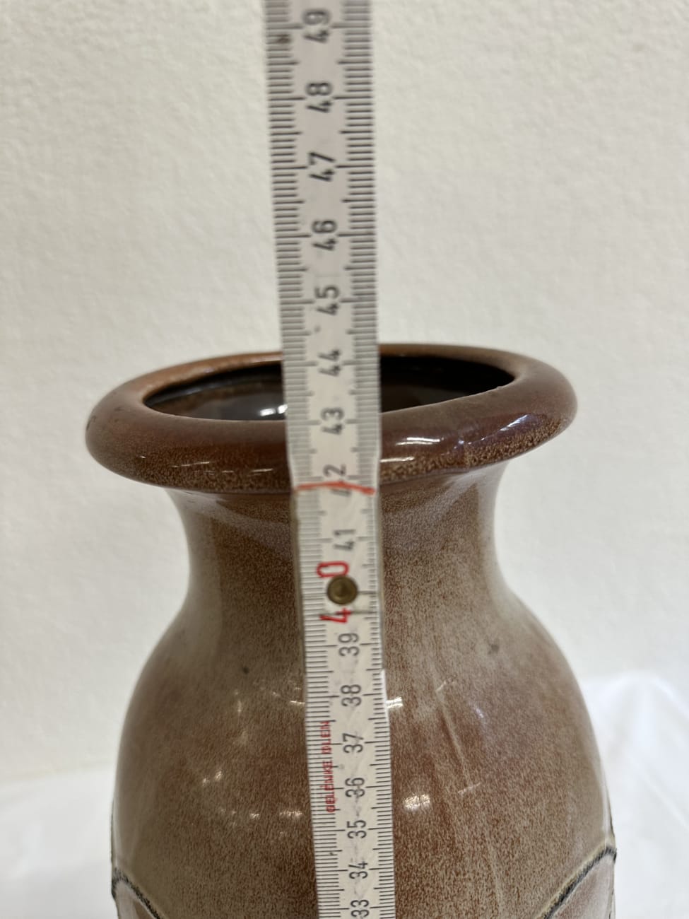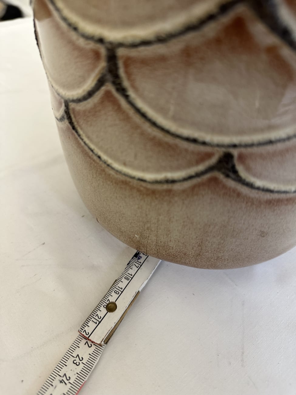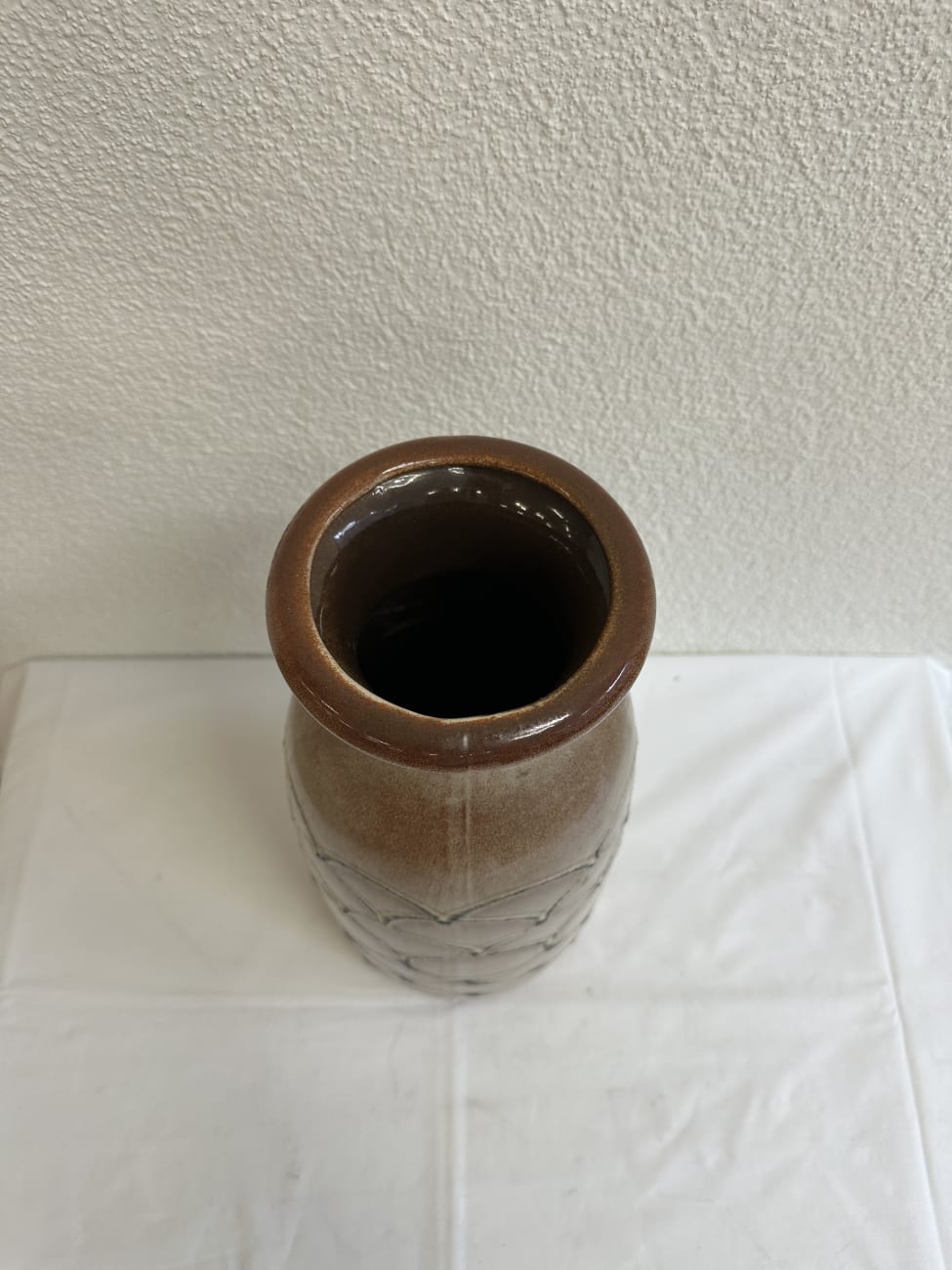 Diese Vintage Keramikvase von Scheurich aus West Germany stammt aus den 1970er Jahren und zeigt ein dekoratives Relief aus übereinanderliegenden, schuppenartigen Formen. Die beige bis braune Verlaufsglasur mit dunklen Konturen betont das plastische Muster und verleiht der Oberfläche Tiefe. Solche Modelle gehörten zu den typischen Exportkeramiken der deutschen Studiokeramik dieser Zeit.