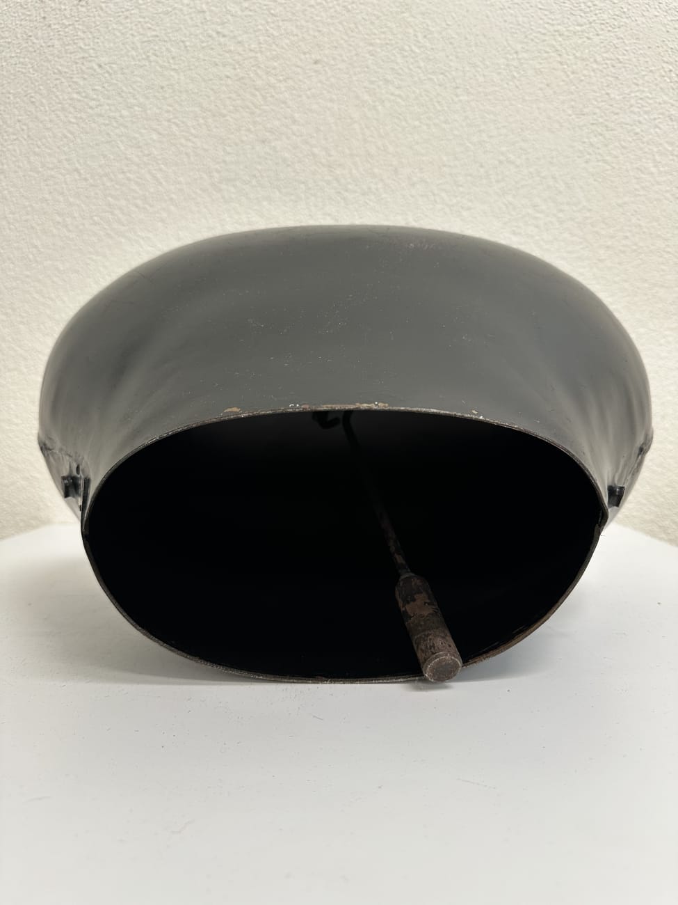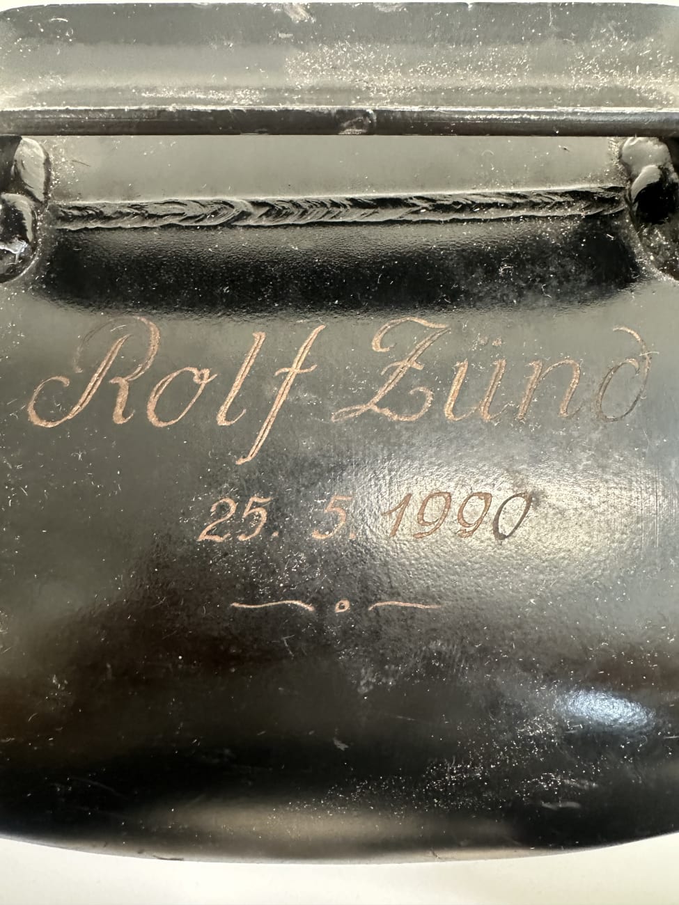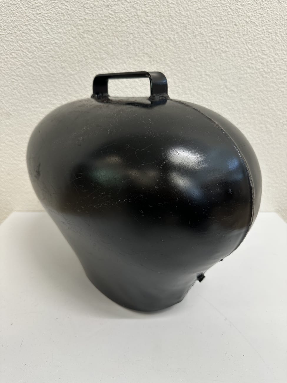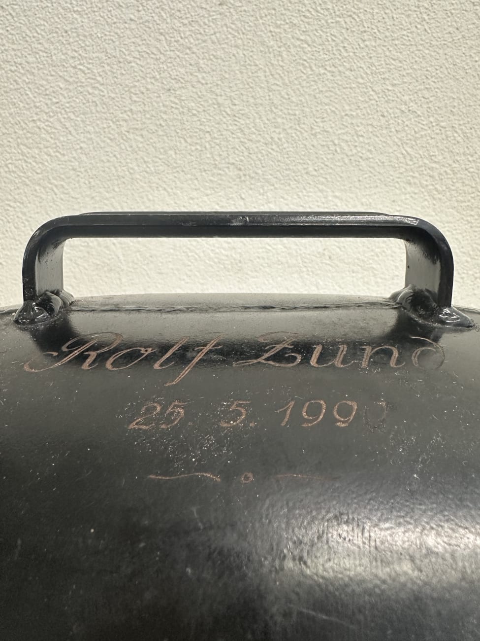 Schwarz lackiertes Metall, sauber geformt und rund verschweisst. Die Gravur deutet auf eine persönliche Widmung hin, wie sie bei Treicheln oft als Geschenk oder Erinnerung angebracht wurde. Solche Stücke sind fest mit der Schweizer Tradition verbunden und werden bis heute geschätzt. Die kompakte, kräftige Form wirkt ruhig und authentisch. Innen ist der originale Klöppel vorhanden und sorgt für den typischen, tiefen Klang.