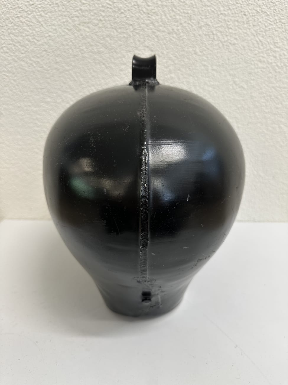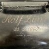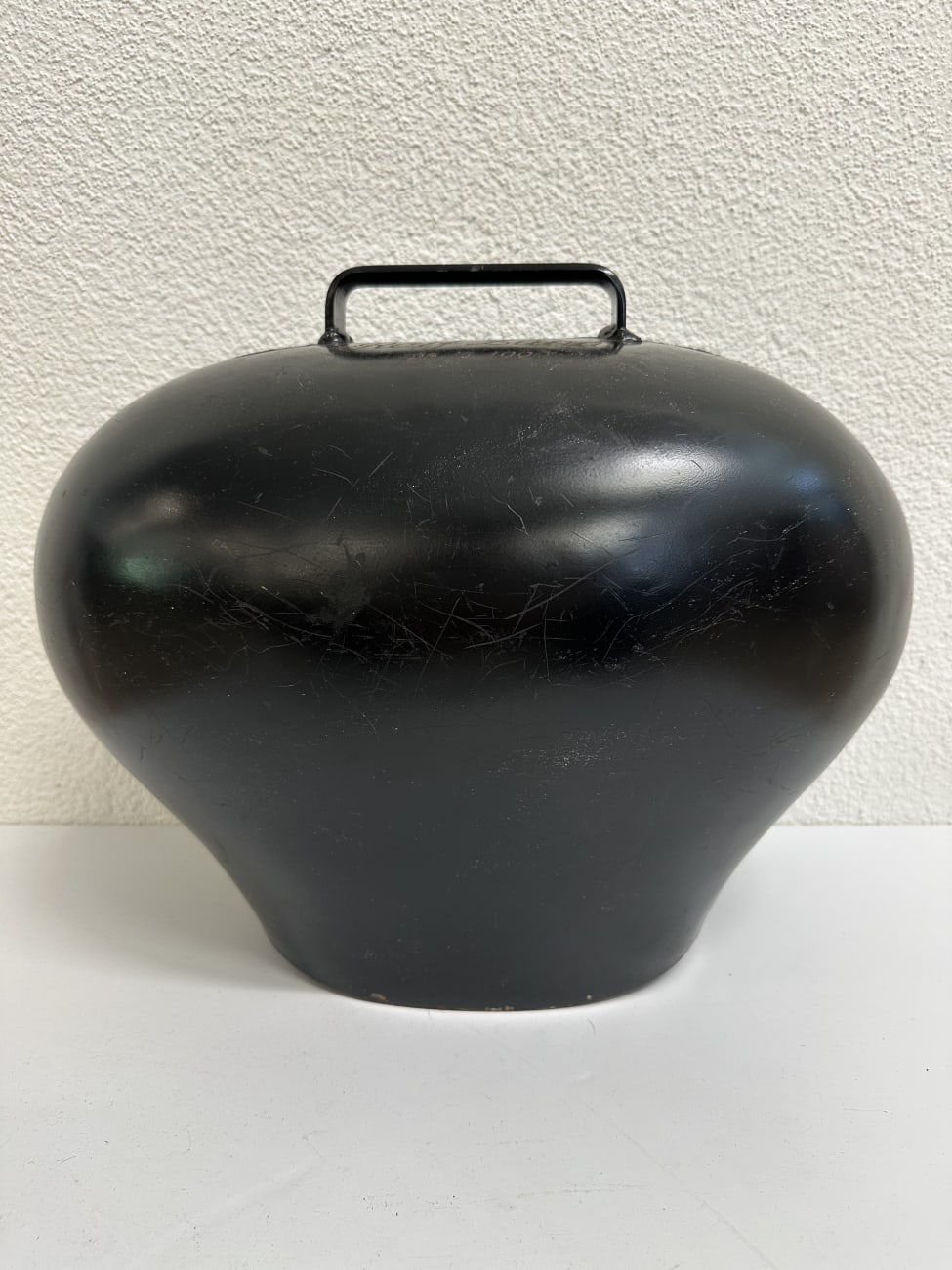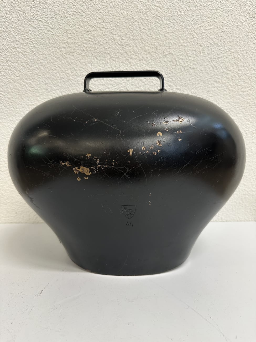 Schwarz lackiertes Metall, sauber geformt und rund verschweisst. Die Gravur deutet auf eine persönliche Widmung hin, wie sie bei Treicheln oft als Geschenk oder Erinnerung angebracht wurde. Solche Stücke sind fest mit der Schweizer Tradition verbunden und werden bis heute geschätzt. Die kompakte, kräftige Form wirkt ruhig und authentisch. Innen ist der originale Klöppel vorhanden und sorgt für den typischen, tiefen Klang.