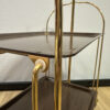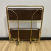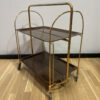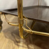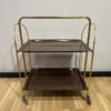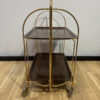 Dieser elegante Vintage-Servierwagen aus den 1970er Jahren bringt zeitlosen Mid-Century-Charme in jedes Interieur. Der Rahmen aus vergoldetem Metall verleiht dem Möbelstück eine edle Note, während die beiden Ablagen in dunkler Holzoptik für Wärme und Kontrast sorgen.
