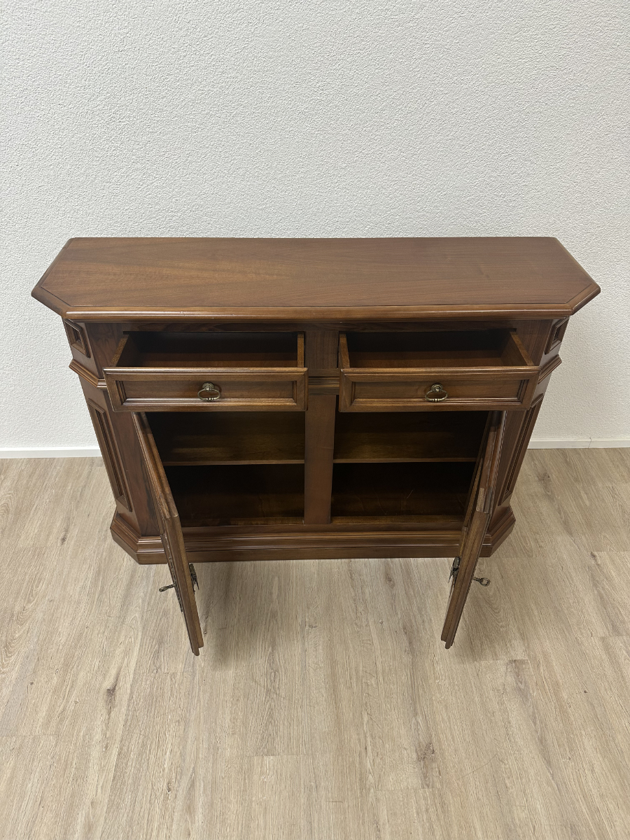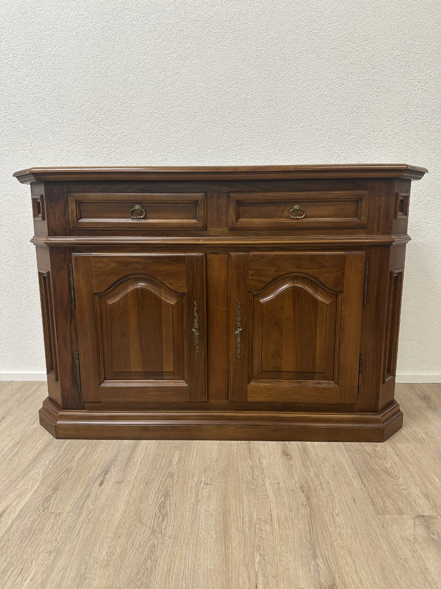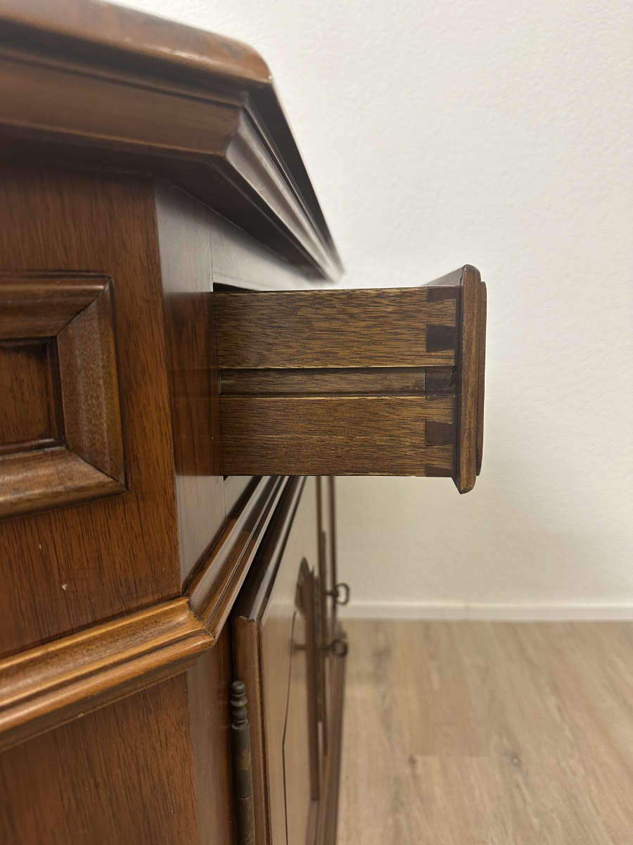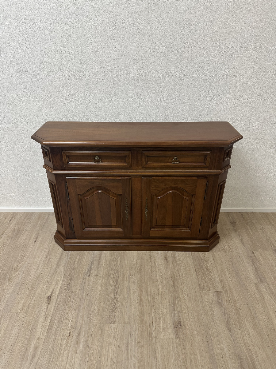 2 Schubladen oben und darunter zwei Türen mit viel Stauraum machen dieses Vintage Möbel richtig alltagstauglich. Der warme Holzton, die profilierten Rahmenfüllungen und die abgeschrägte Deckplatte wirken ruhig und wertig. Ringgriffe und Schlüsselschilder aus Messing setzen den passenden Akzent und geben dem Sideboard den typischen Charakter. Die Türen sind abschliessbar, passende Schlüssel sind dabei.