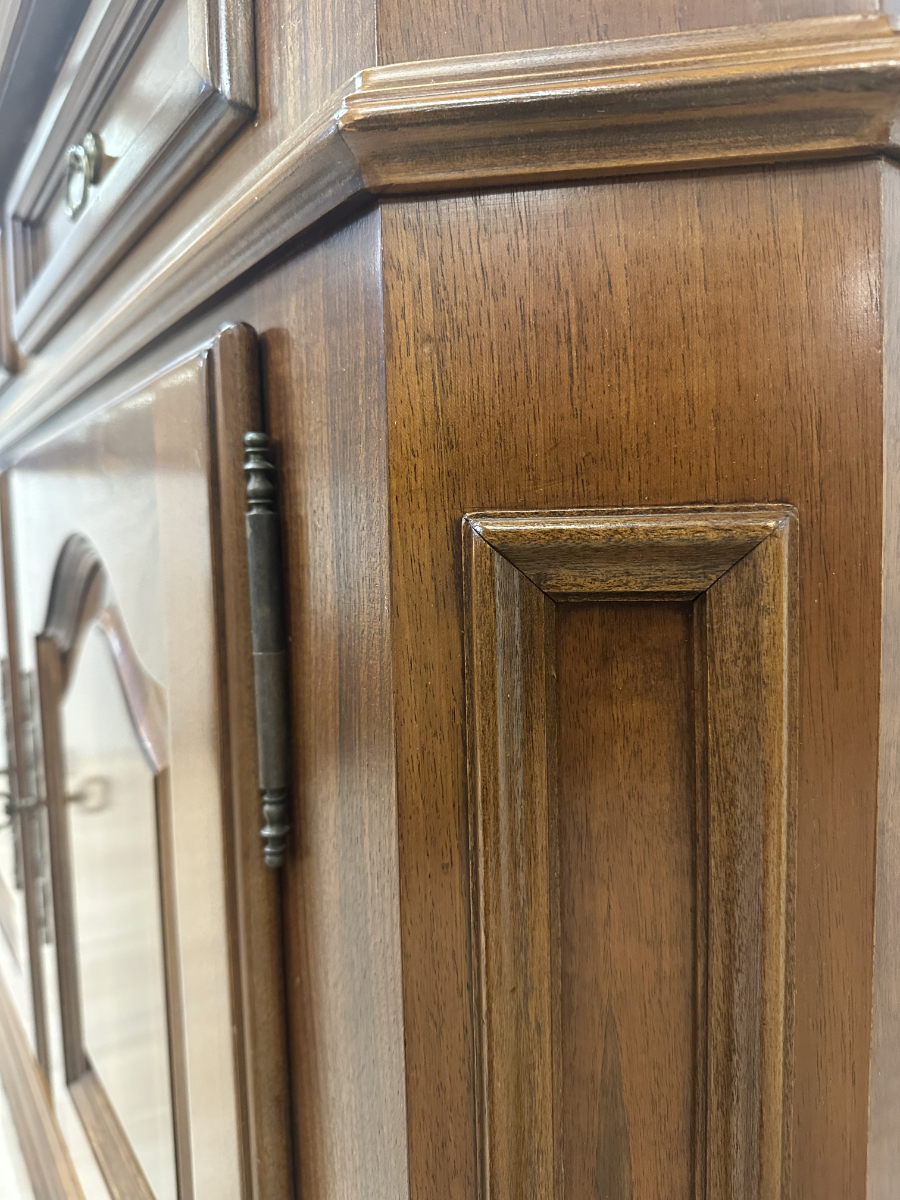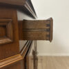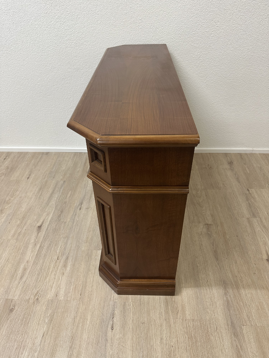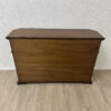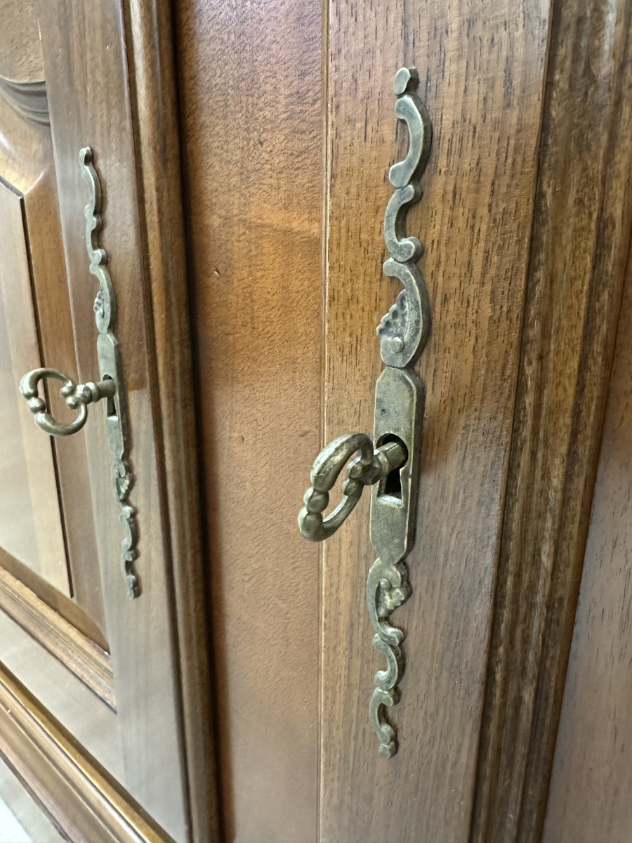 2 Schubladen oben und darunter zwei Türen mit viel Stauraum machen dieses Vintage Möbel richtig alltagstauglich. Der warme Holzton, die profilierten Rahmenfüllungen und die abgeschrägte Deckplatte wirken ruhig und wertig. Ringgriffe und Schlüsselschilder aus Messing setzen den passenden Akzent und geben dem Sideboard den typischen Charakter. Die Türen sind abschliessbar, passende Schlüssel sind dabei.