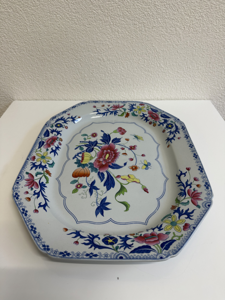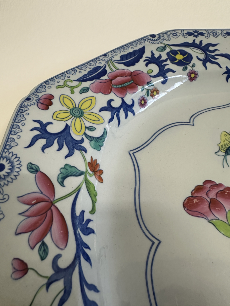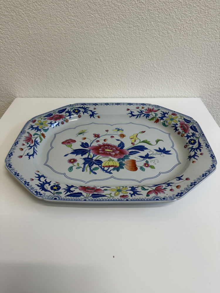 Kräftige Farben, feine Linien und ein ausgewogenes Gesamtbild. Diese grosse Servierplatte von Spode zeigt ein reiches florales Dekor mit Blüten, Ranken und kleinen Schmetterlingen in Blau, Rot, Gelb und Grün. Die oktogonale Form verleiht dem Stück eine klare Kontur und hebt es deutlich von einfachen runden Platten ab. Gefertigt aus Stone China überzeugt sie durch stabile Ausführung und eine angenehm glatte Glasur. Das klassische Spode Muster wirkt lebendig, ohne überladen zu sein, und passt sowohl zu traditionellem Geschirr als auch als einzelnes Statement auf Tisch oder Sideboard.