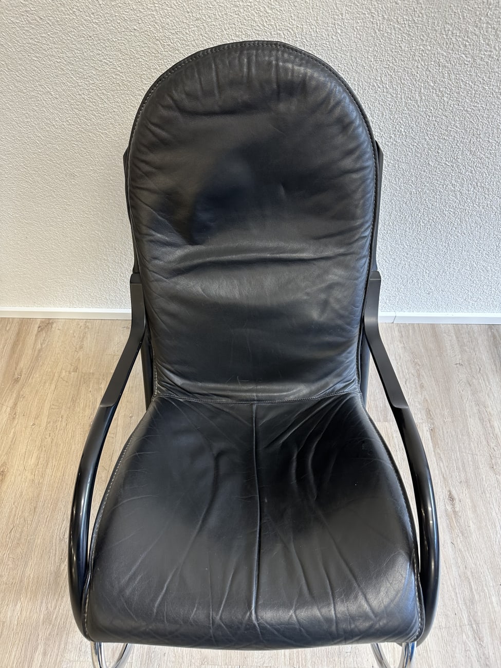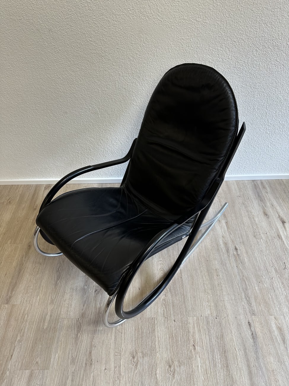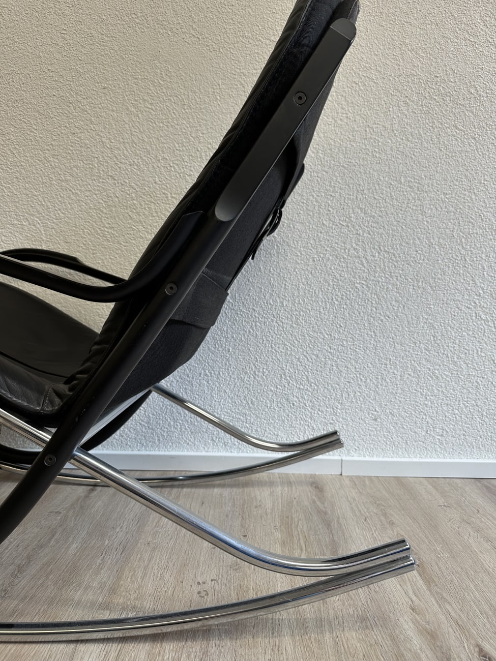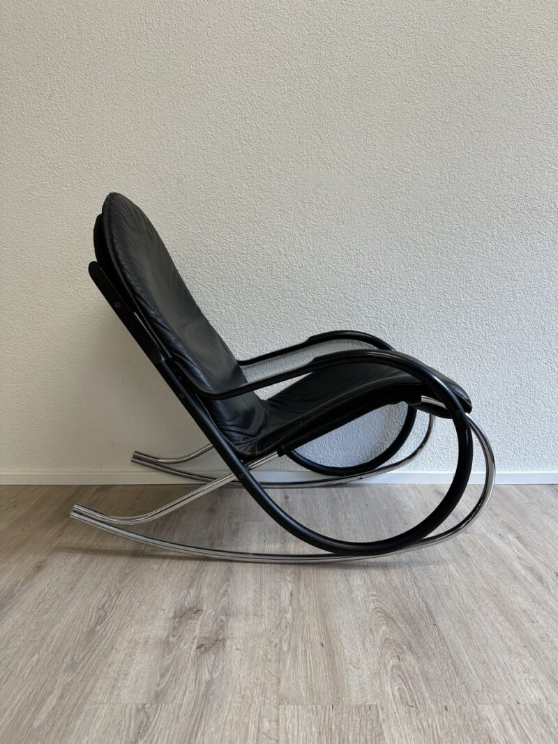 Klare Rundungen, leicht federnde Bewegung und ein Design, das sofort auffällt. Dieser Vintage Schaukelstuhl stammt aus der Nonna Serie von Strässle und wurde von Paul Tuttle entworfen. Typisch sind die grosszügigen Rohrbögen, die den Stuhl optisch tragen und gleichzeitig für die ruhige Schaukelbewegung sorgen. Schwarzer Lederbezug trifft auf mattes und verchromtes Metall, was dem Stück eine ruhige, hochwertige Ausstrahlung gibt. Bequem genug für längeres Sitzen und markant genug, um als Blickfang im Raum zu wirken.