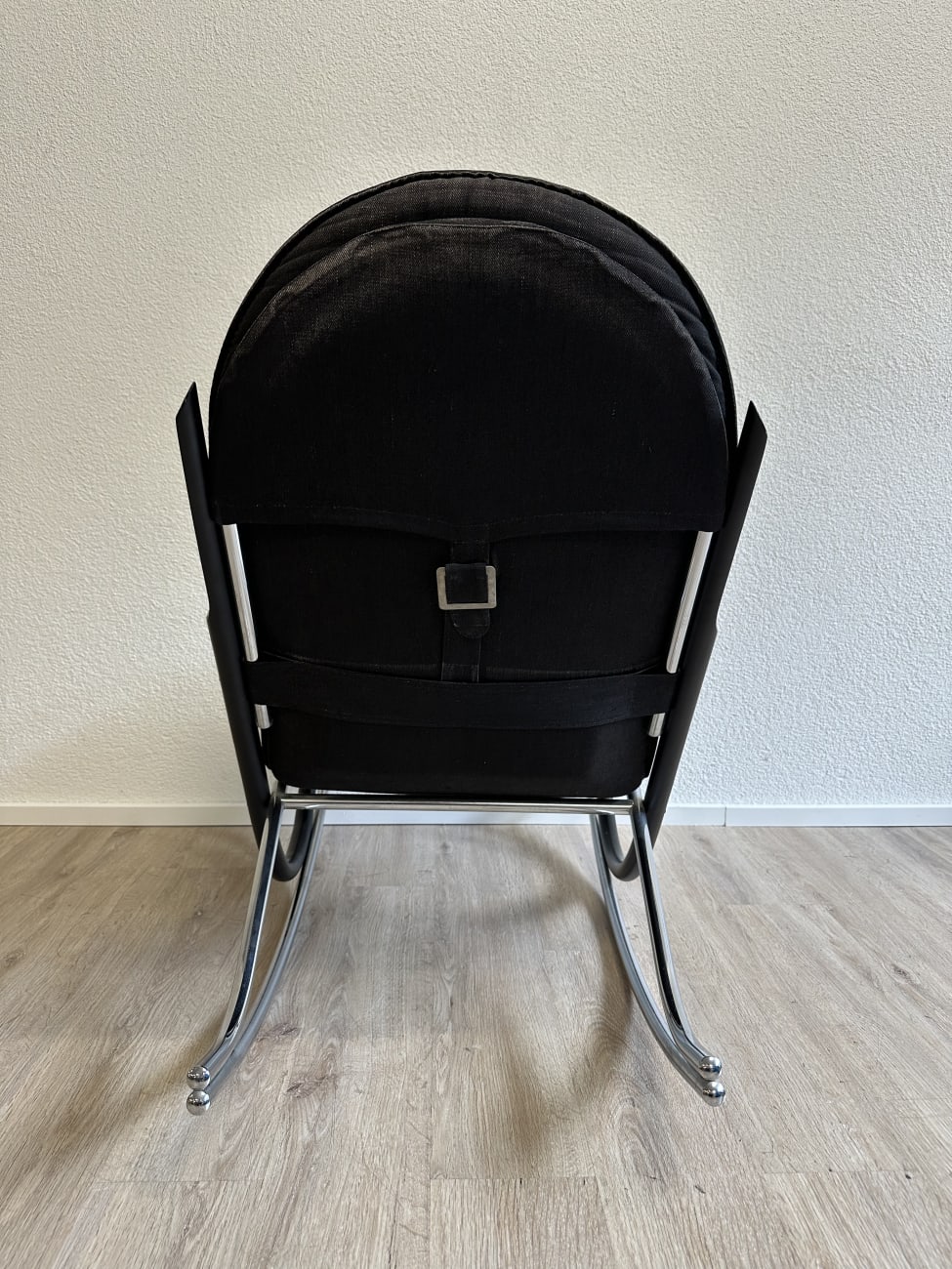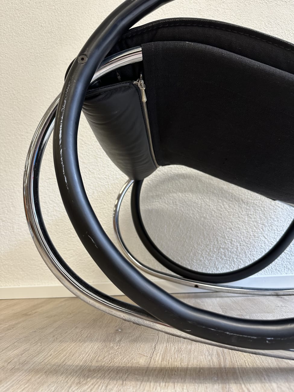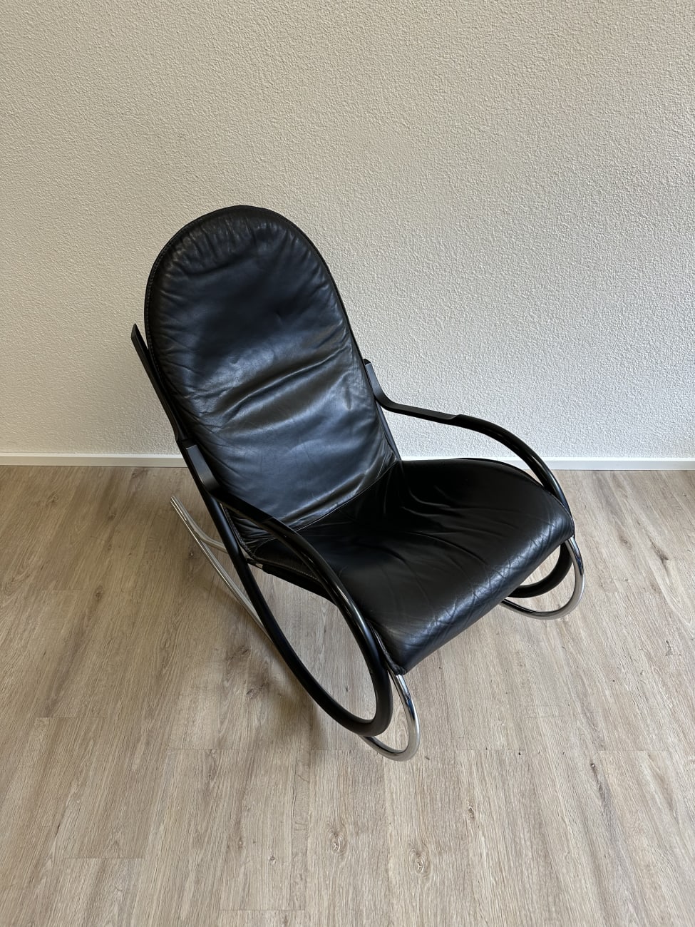 Klare Rundungen, leicht federnde Bewegung und ein Design, das sofort auffällt. Dieser Vintage Schaukelstuhl stammt aus der Nonna Serie von Strässle und wurde von Paul Tuttle entworfen. Typisch sind die grosszügigen Rohrbögen, die den Stuhl optisch tragen und gleichzeitig für die ruhige Schaukelbewegung sorgen. Schwarzer Lederbezug trifft auf mattes und verchromtes Metall, was dem Stück eine ruhige, hochwertige Ausstrahlung gibt. Bequem genug für längeres Sitzen und markant genug, um als Blickfang im Raum zu wirken.