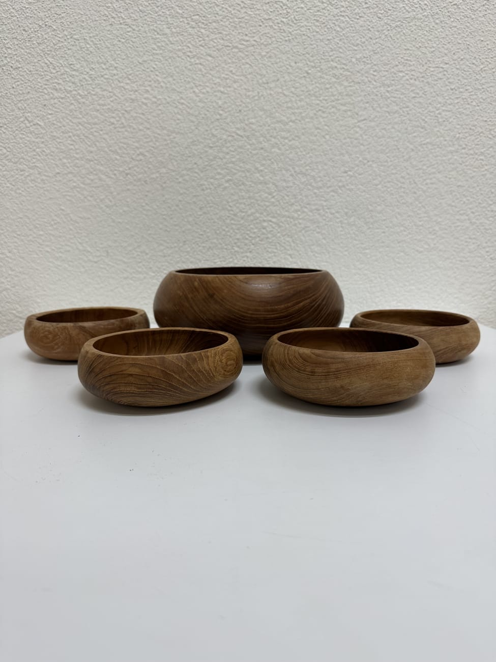 Warme Holzfarben, sichtbare Jahresringe und eine ruhige, runde Form machen dieses Set sofort auffällig. Gefertigt aus massivem Teakholz, jede Schale einzeln gedrechselt und dadurch leicht unterschiedlich im Verlauf der Maserung. Typisch für die 60er Jahre, als solche Holzarbeiten oft in Handarbeit entstanden sind. Die grosse Schale eignet sich ideal als Mittelpunkt, die kleineren perfekt zum Servieren oder als Ergänzung. Zusammen ergibt sich ein stimmiges, ruhiges Gesamtbild auf jedem Tisch.