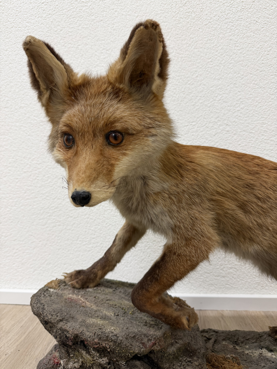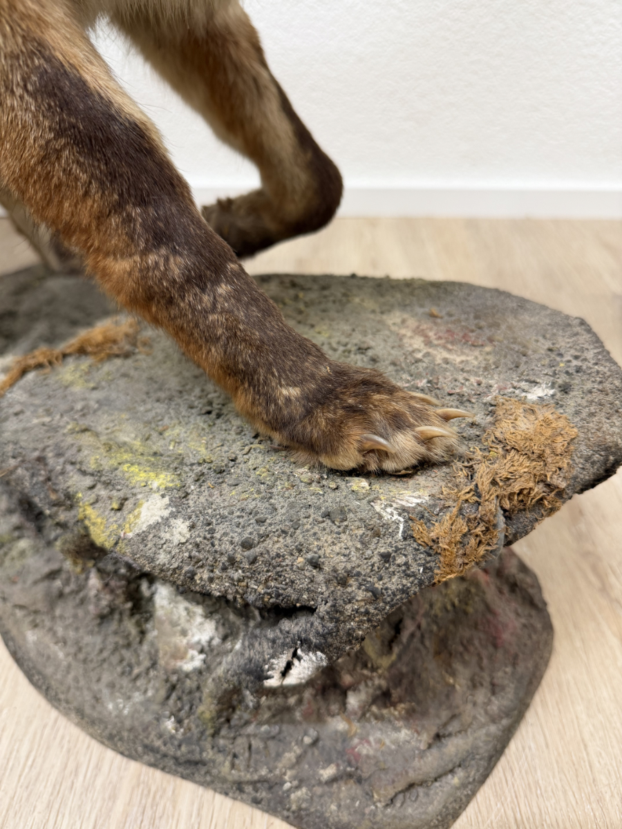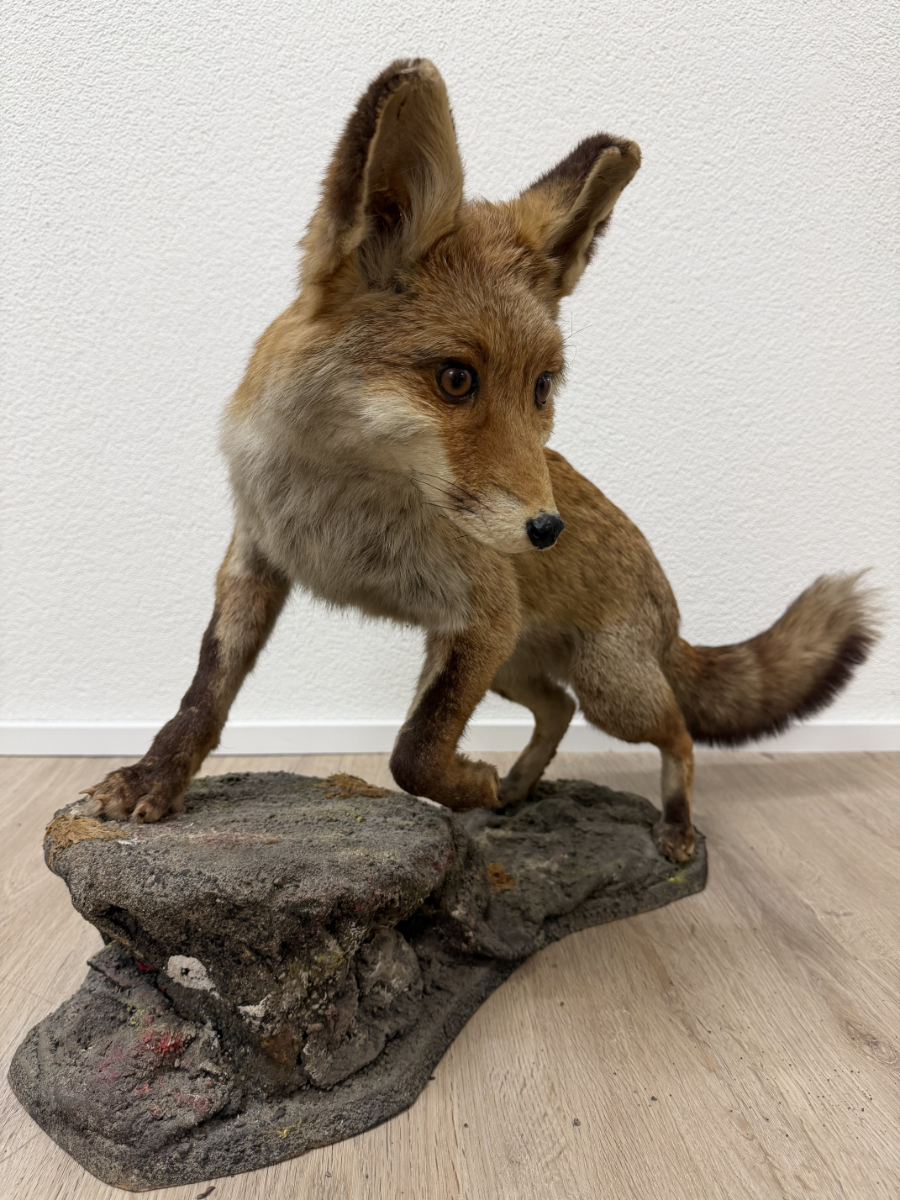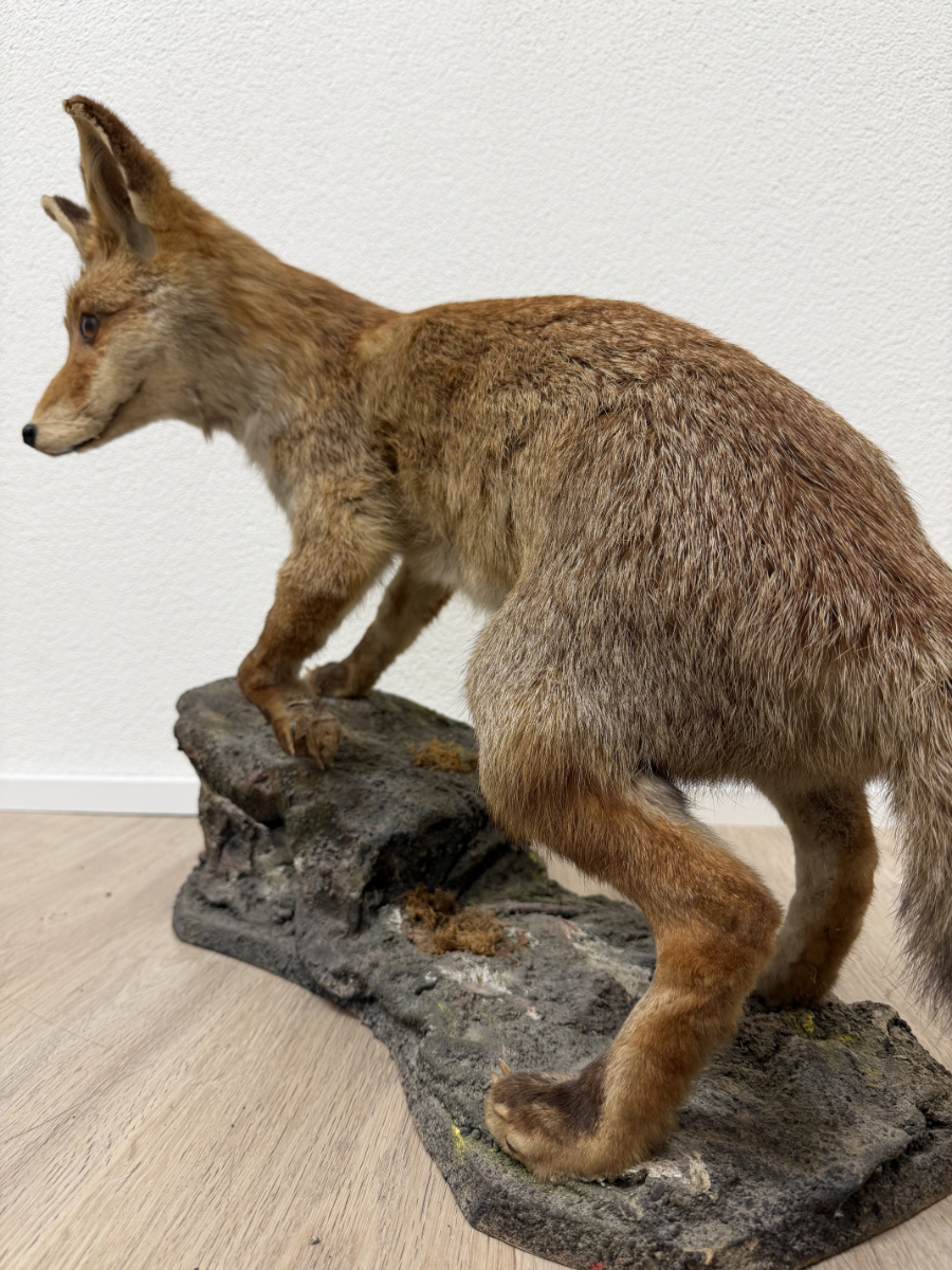 Naturgetreue Proportionen, gespannte Körperhaltung und ein wachsamer Blick prägen dieses ausdrucksstarke Vintage-Tierpräparat eines Rotfuchses. Die Darstellung zeigt das Tier in Schrittbewegung auf einem modellierten Fels-Sockel, was der Szene Tiefe und Dynamik verleiht. Fellzeichnung in warmen Rot-, Braun- und Beigetönen, dichter Schweif und fein ausgearbeiteter Kopfbereich mit Glasaugen. Der Sockel ist landschaftlich gestaltet und bildet eine stabile Einheit mit dem Präparat. Es handelt sich vermutlich um eine Arbeit aus dem zoologischen Präparatorium „St. Hubertus“. Ein dekoratives Objekt mit klassischem Jagd- und Naturbezug, wie er in der Mitte des 20. Jahrhunderts beliebt war.