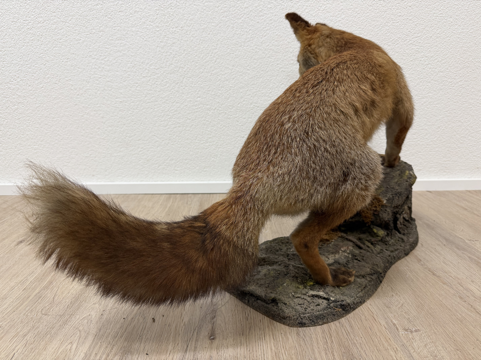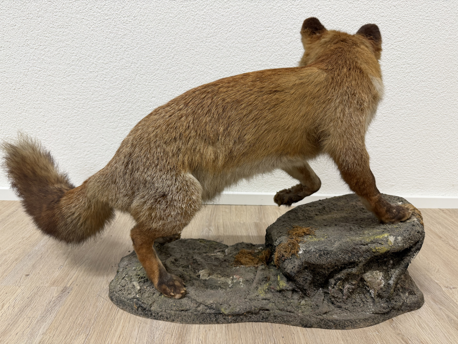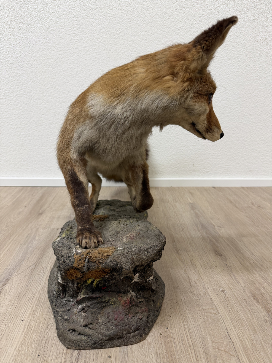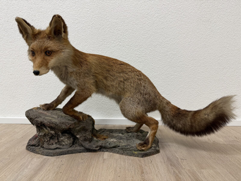 Naturgetreue Proportionen, gespannte Körperhaltung und ein wachsamer Blick prägen dieses ausdrucksstarke Vintage-Tierpräparat eines Rotfuchses. Die Darstellung zeigt das Tier in Schrittbewegung auf einem modellierten Fels-Sockel, was der Szene Tiefe und Dynamik verleiht. Fellzeichnung in warmen Rot-, Braun- und Beigetönen, dichter Schweif und fein ausgearbeiteter Kopfbereich mit Glasaugen. Der Sockel ist landschaftlich gestaltet und bildet eine stabile Einheit mit dem Präparat. Es handelt sich vermutlich um eine Arbeit aus dem zoologischen Präparatorium „St. Hubertus“. Ein dekoratives Objekt mit klassischem Jagd- und Naturbezug, wie er in der Mitte des 20. Jahrhunderts beliebt war.