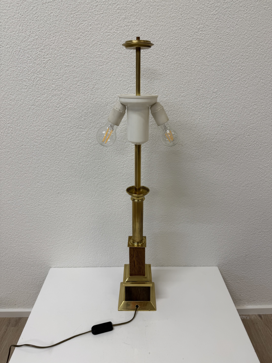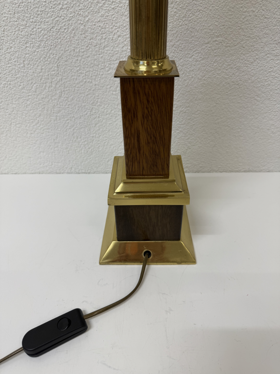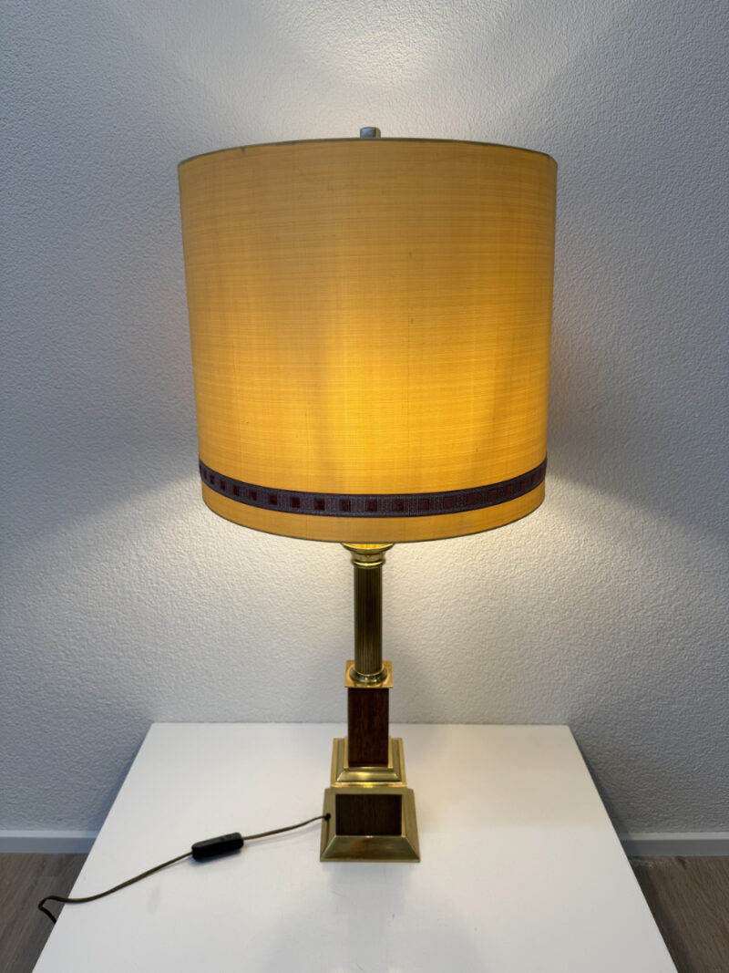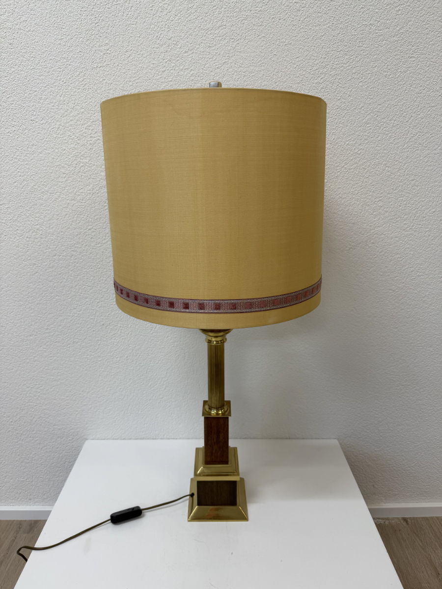 Messingfarbener Fuss mit klarer, gestufter Form, kombiniert mit dunklem Holz und einer gerillten Säule. Der zylindrische Stoffschirm in warmem Gelbton sorgt für ein weiches, angenehmes Licht und trägt eine dezente umlaufende Zierborte. Die Proportionen wirken ausgewogen, nichts ist verspielt oder überladen. Typisch für hochwertige Wohnleuchten aus den 1970er und frühen 1980er Jahren, als solide Materialien und ruhige Formen im Vordergrund standen. Die Lampe ist mit zwei Leuchtmitteln ausgestattet und wird über einen Schnurschalter bedient.