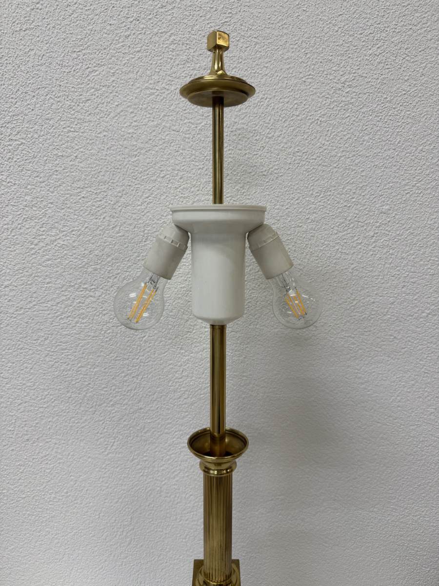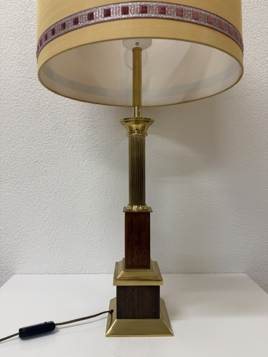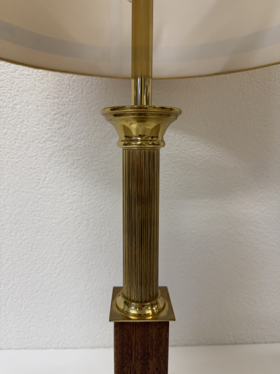 Messingfarbener Fuss mit klarer, gestufter Form, kombiniert mit dunklem Holz und einer gerillten Säule. Der zylindrische Stoffschirm in warmem Gelbton sorgt für ein weiches, angenehmes Licht und trägt eine dezente umlaufende Zierborte. Die Proportionen wirken ausgewogen, nichts ist verspielt oder überladen. Typisch für hochwertige Wohnleuchten aus den 1970er und frühen 1980er Jahren, als solide Materialien und ruhige Formen im Vordergrund standen. Die Lampe ist mit zwei Leuchtmitteln ausgestattet und wird über einen Schnurschalter bedient.