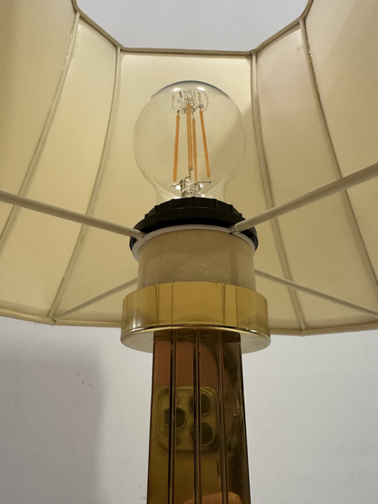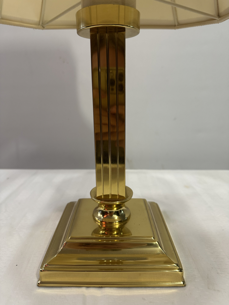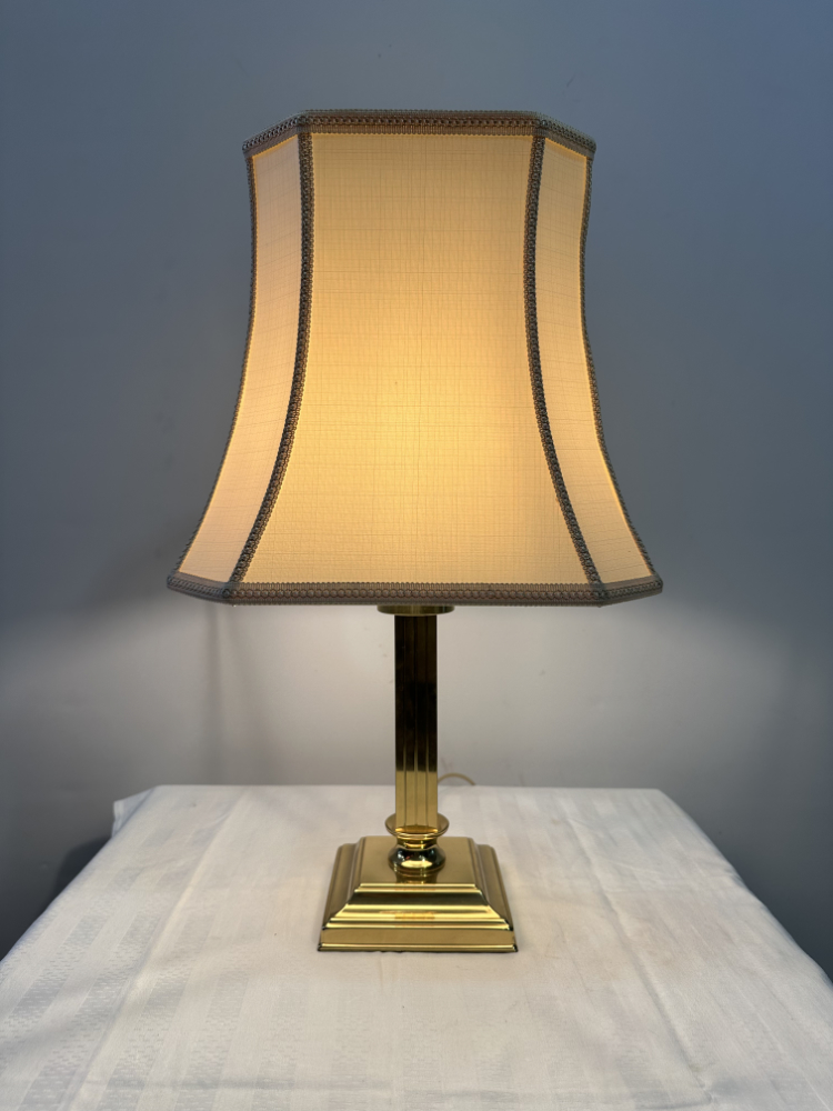 Diese elegante Tischlampe verbindet klassischen Stil mit nostalgischem Charme. Der schwere Fuss aus massivem Messing trägt einen geschwungenen, cremefarbenen Stoffschirm mit feiner Goldborte, eine Kombination, wie man sie aus edlen Wohninterieurs der 1970er bis 1990er Jahre kennt. Das warme Licht schafft eine angenehme Atmosphäre, ideal für Lesebereiche, Wohnzimmer oder stilvolle Schlafzimmer.