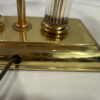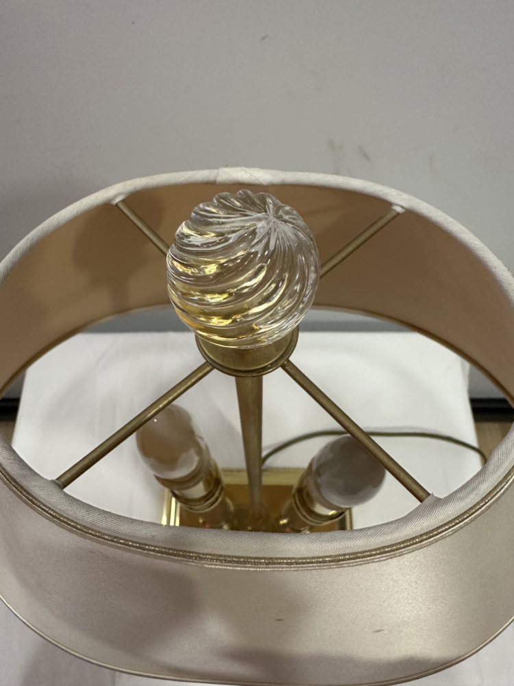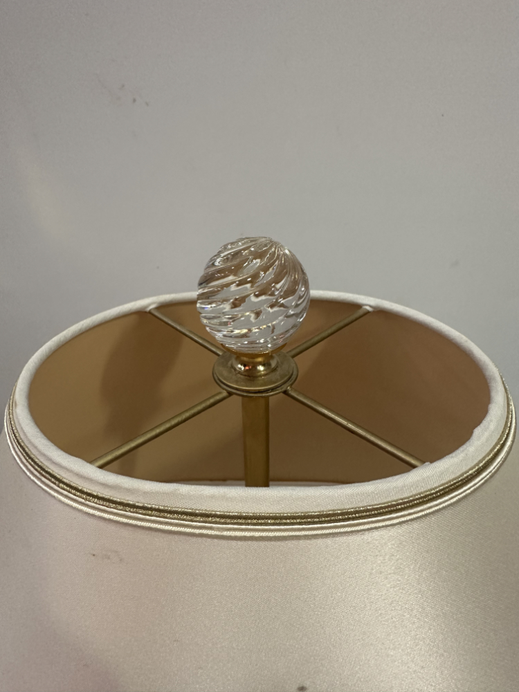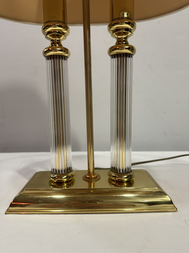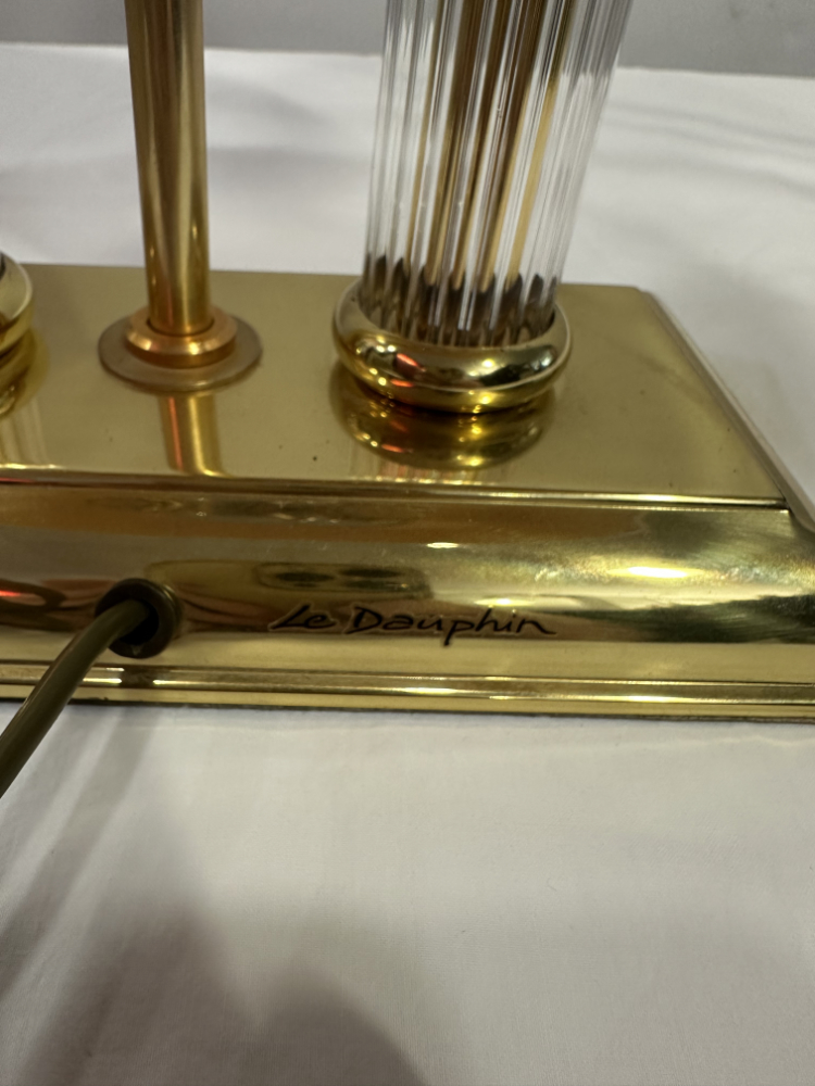 Diese edle Vintage Tischlampe stammt von Le Dauphin France, einem renommierten französischen Hersteller für Designleuchten. Zwei gerillte Glas-Säulen auf glänzender Messingbasis tragen den ovalen Satin-Schirm, der das Licht weich und gleichmässig verteilt. Der klare Glasknauf am oberen Abschluss rundet das elegante Erscheinungsbild ab.