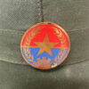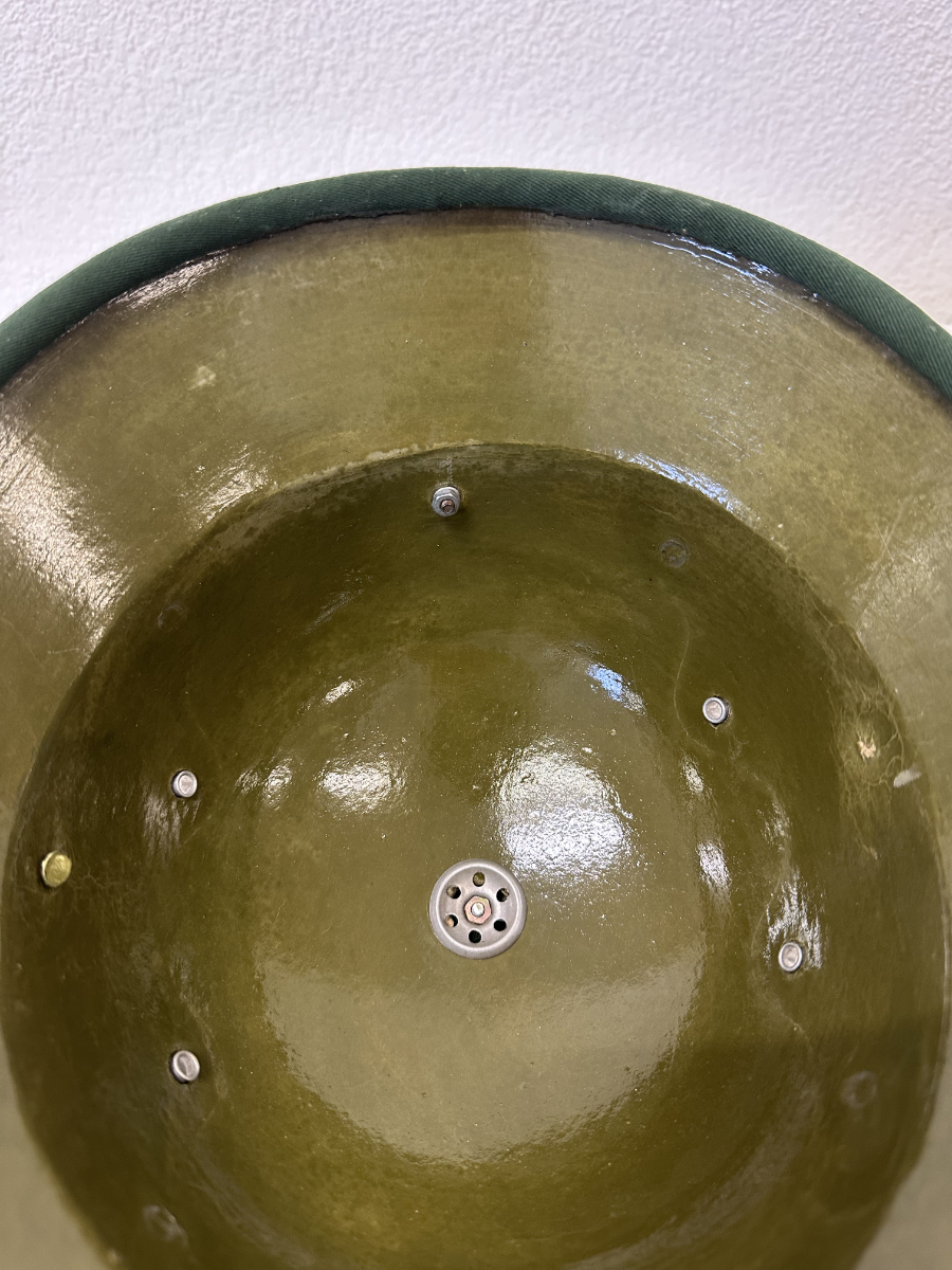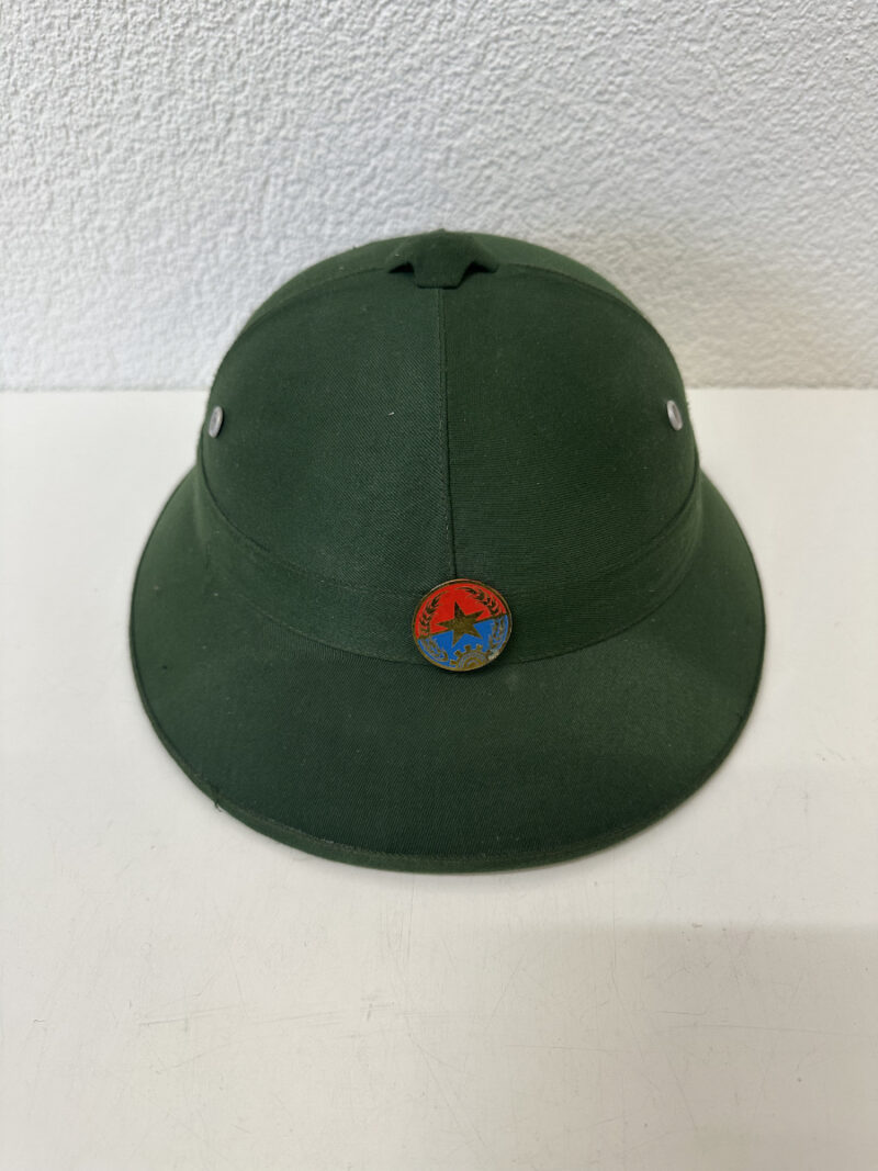 Dunkelgrüner Tropenhelm im typischen Safari-Stil mit stabiler Form und umlaufender Krempe. Vorne sitzt ein emailliertes Abzeichen mit Sternmotiv und farbiger Gestaltung in Rot, Blau und Gold. Innen zeigt sich eine feste, glatt beschichtete Schale mit Nieten, dazu Belüftungsösen aus Metall. Die Machart und die Materialien deuten auf die zweite Hälfte des 20. Jahrhunderts hin, ungefähr 1960er bis 1980er Jahre. Ideal als Requisite, Deko oder für Sammler, die ungewöhnliche Stücke mögen.