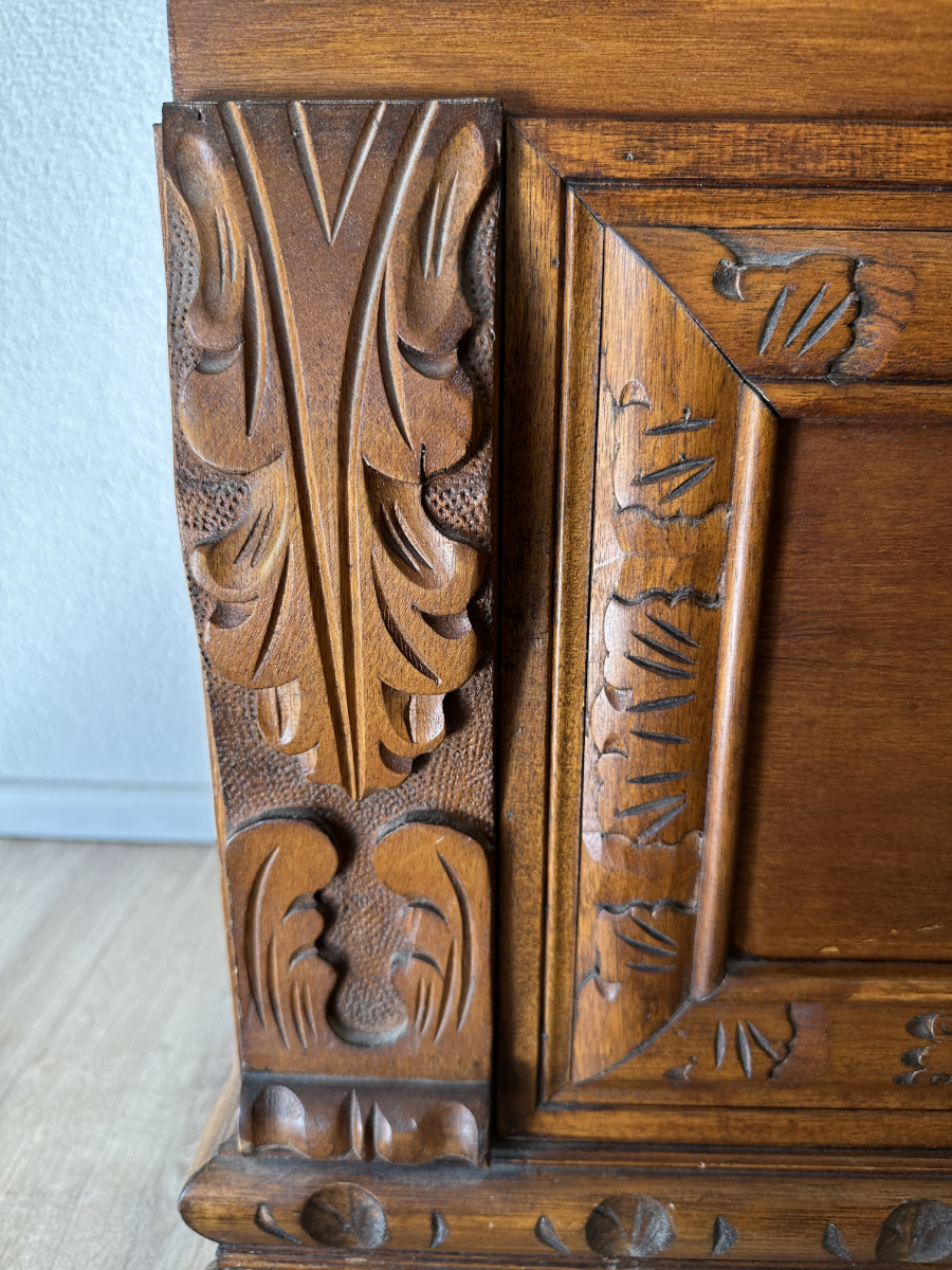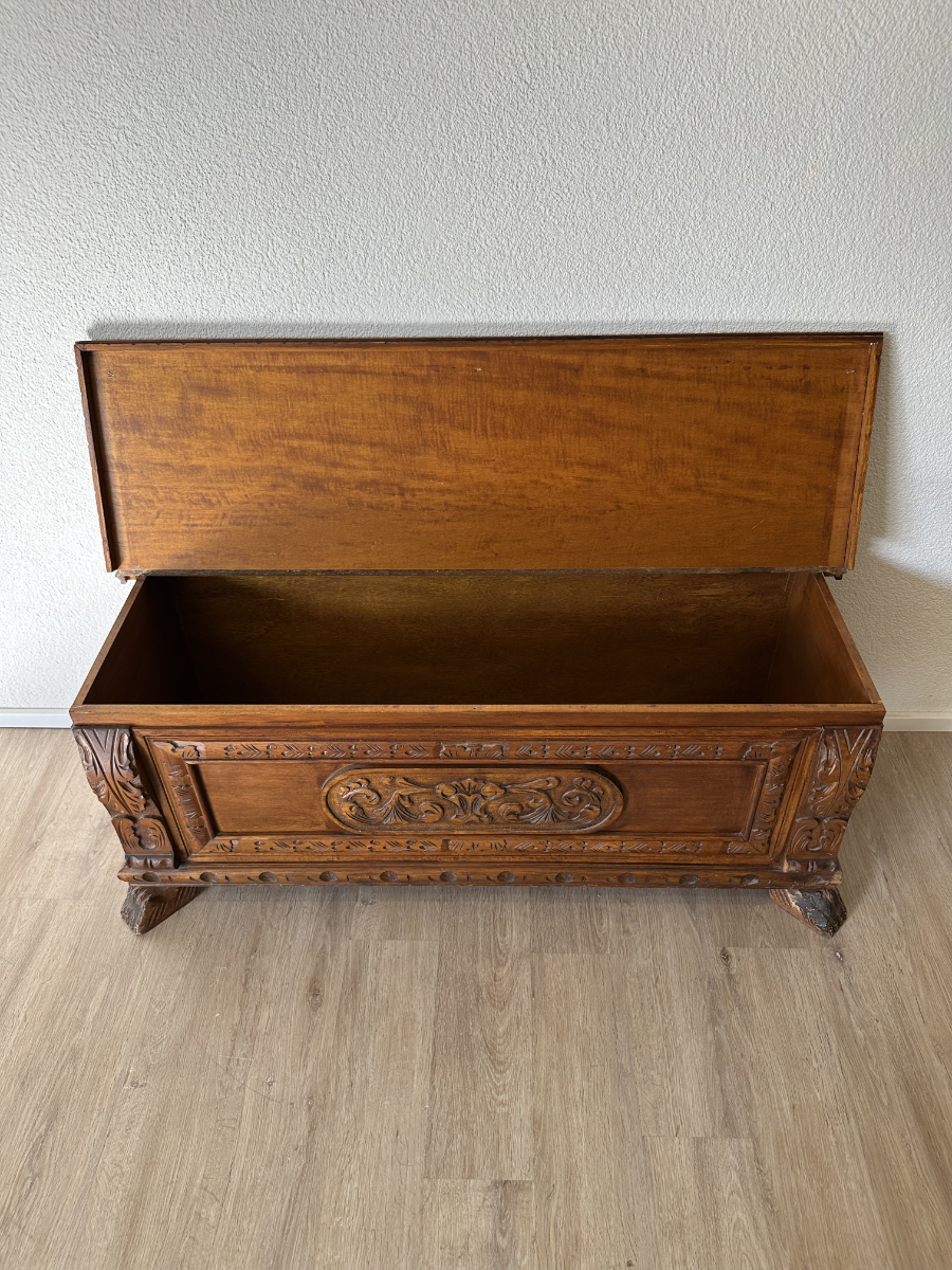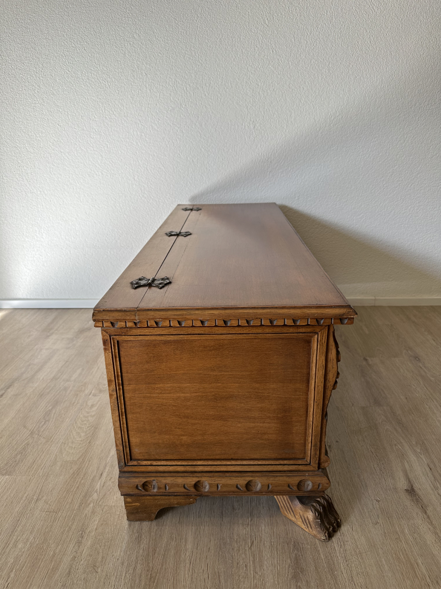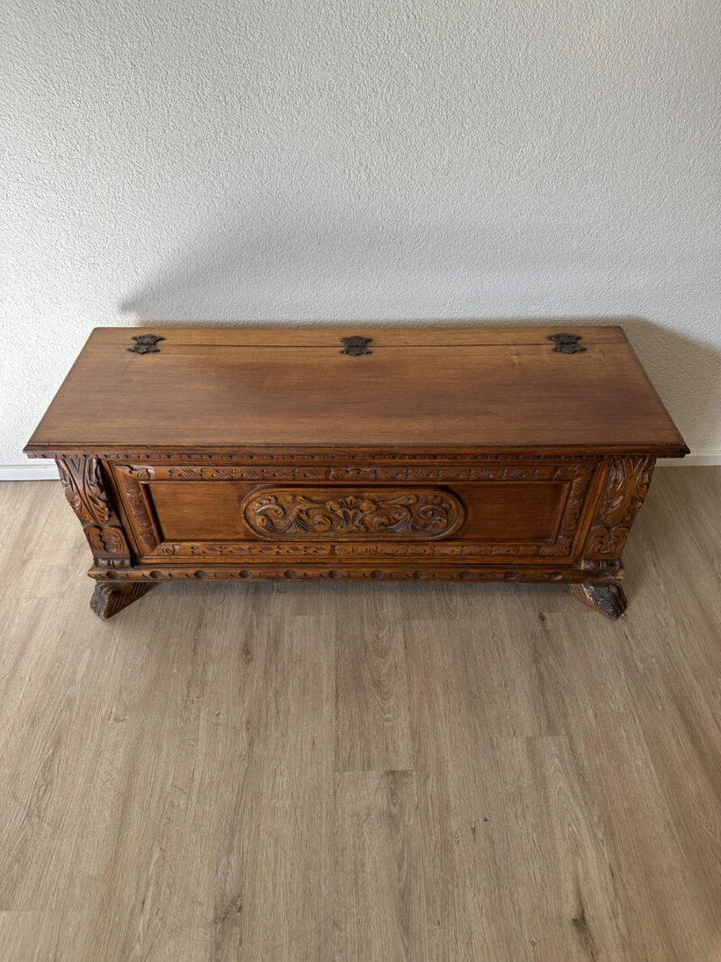 Schnitzereien mit viel Tiefe, schwere Löwenpfoten als Standfüsse und ein Deckel, der sich weit öffnen lässt: Diese Truhe bringt sofort Charakter in den Raum. Die Front ist reich verziert mit floralen Ornamenten und einem zentralen Relief, dazu passend die kräftigen Eckelemente. Innen wartet ein grosses Staufach für Decken, Kissen, Spiele oder Saisonartikel. Ein schönes Stück für alle, die Stauraum wollen, aber nicht auf Wirkung verzichten möchten.