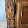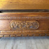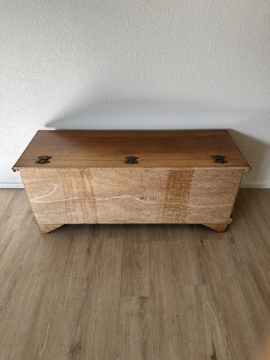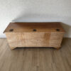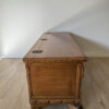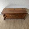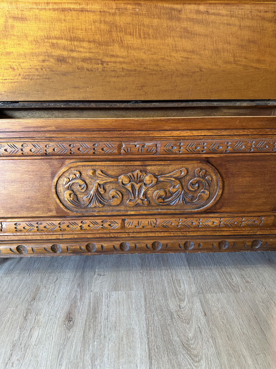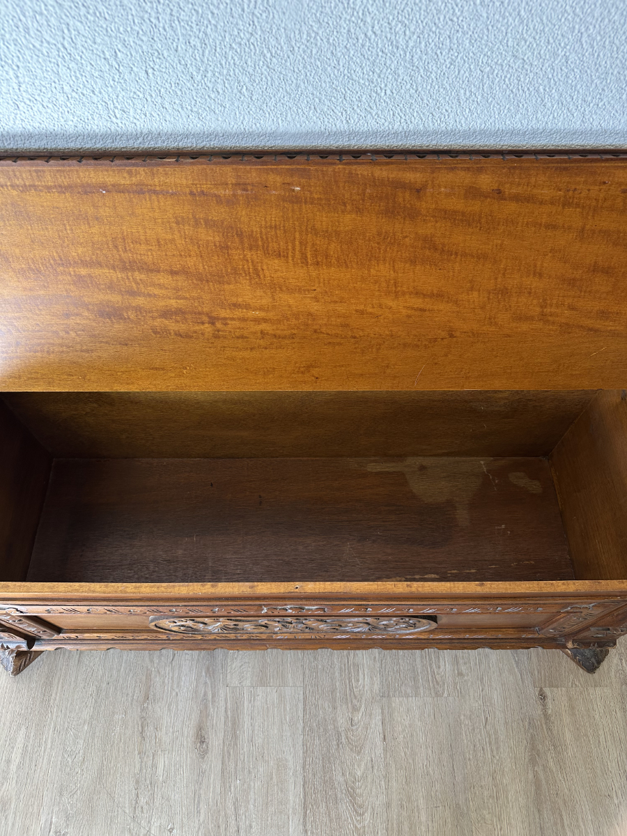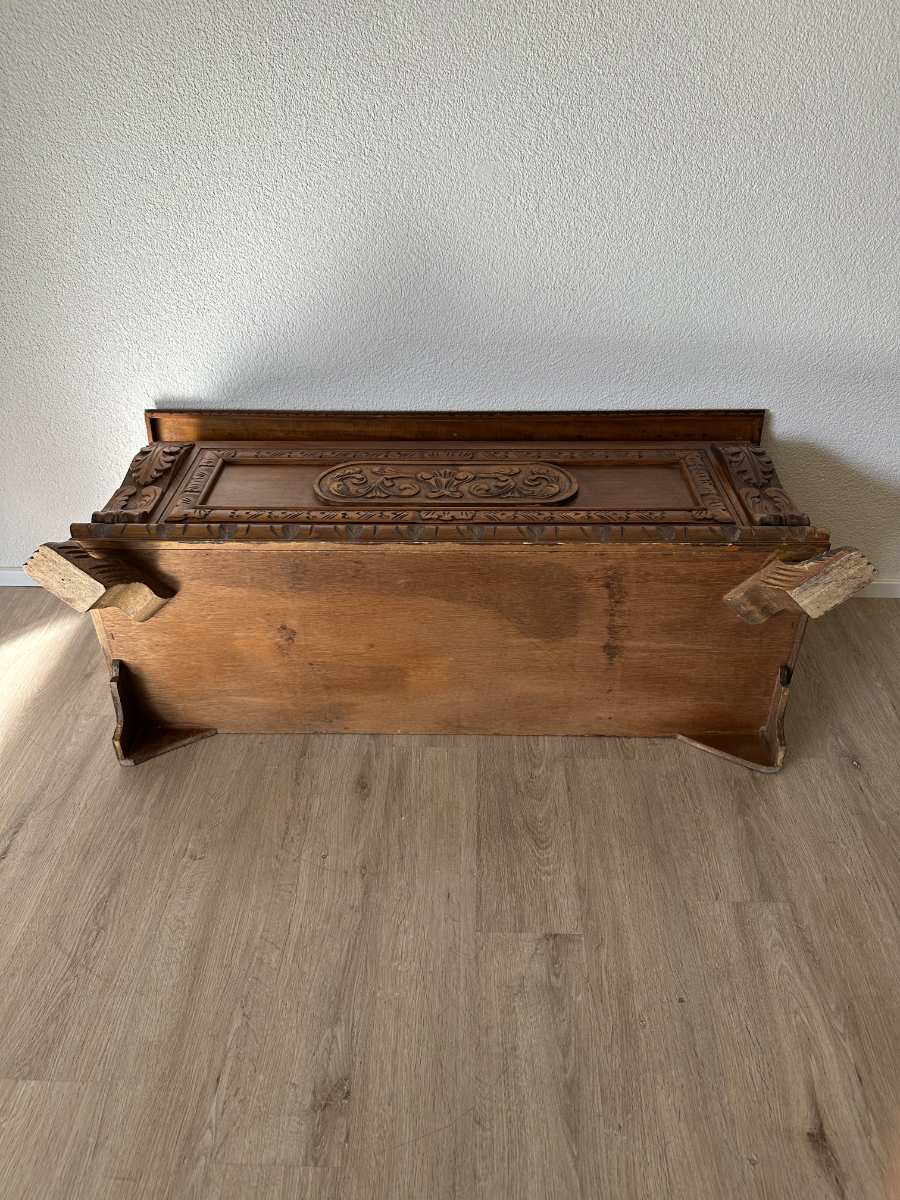 Schnitzereien mit viel Tiefe, schwere Löwenpfoten als Standfüsse und ein Deckel, der sich weit öffnen lässt: Diese Truhe bringt sofort Charakter in den Raum. Die Front ist reich verziert mit floralen Ornamenten und einem zentralen Relief, dazu passend die kräftigen Eckelemente. Innen wartet ein grosses Staufach für Decken, Kissen, Spiele oder Saisonartikel. Ein schönes Stück für alle, die Stauraum wollen, aber nicht auf Wirkung verzichten möchten.