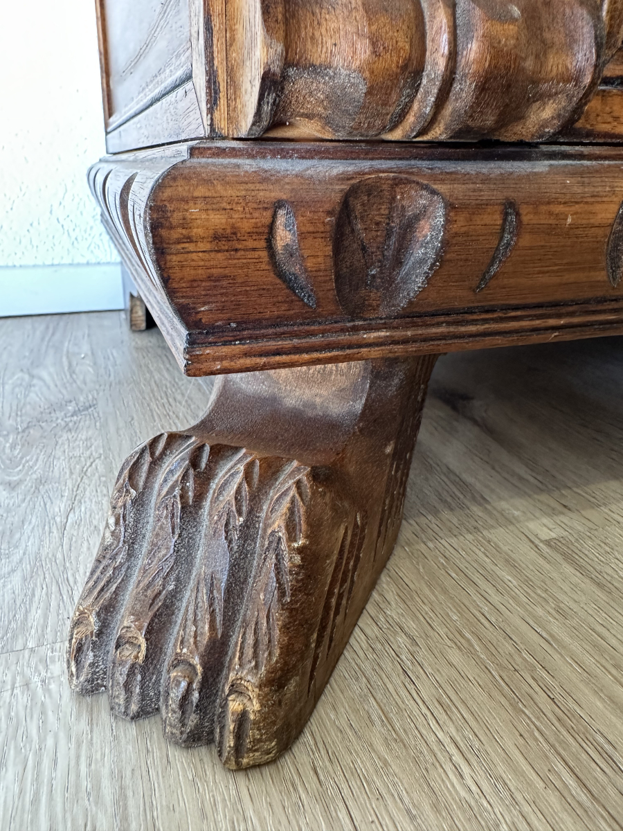 Vintage Truhe mit Schnitzereien und Löwenfüssen