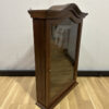 Eleganter Wandvitrinenschrank aus dunkel gebeiztem Holz mit geschwungener Krone und gläserner Tür. Vier Einlegeböden aus Glas bieten Platz für Sammlerstücke, Porzellanfiguren oder kleine Dekorationen. Das formschöne Design mit Messingknauf und geschwungener Front ist typisch für die 1970er Jahre und verbindet klare Handwerksarbeit mit klassischer Linienführung.