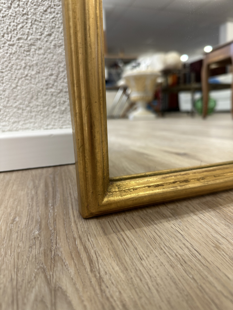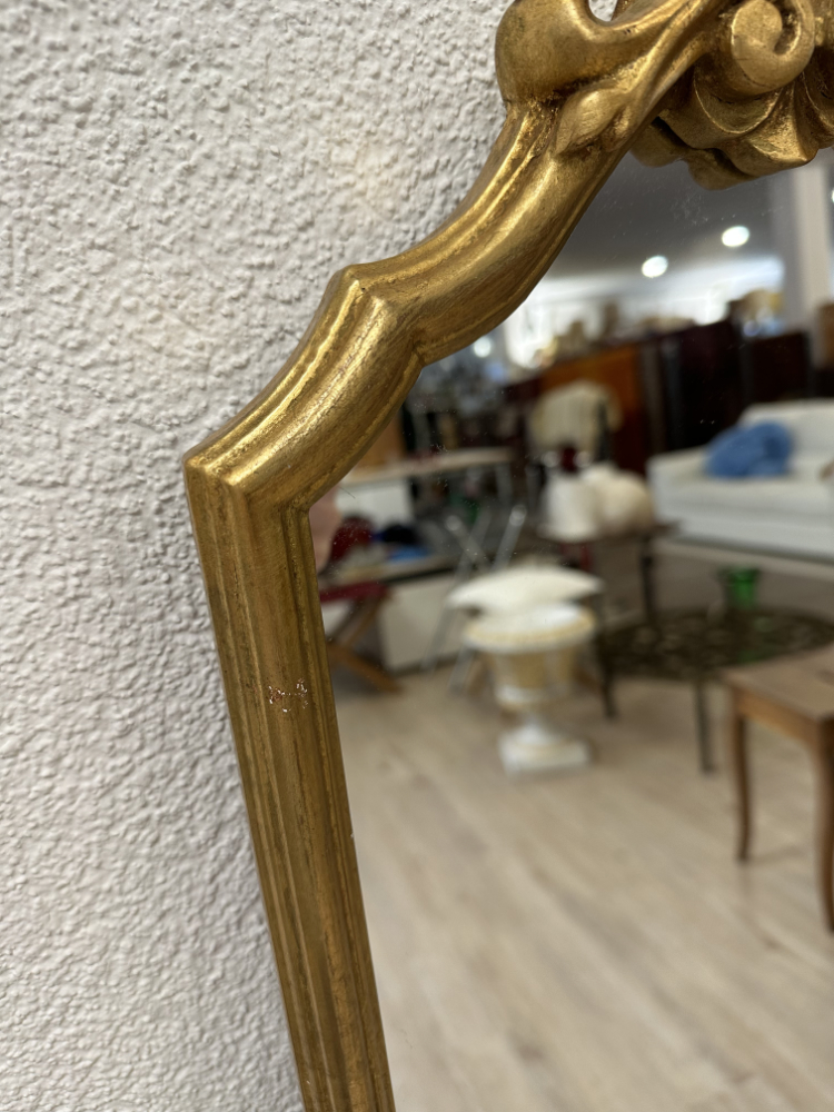 Schlanke Proportionen treffen auf eine elegante, barock inspirierte Linienführung. Dieser hochformatige Wandspiegel überzeugt durch seinen schmalen, vergoldeten Holzrahmen mit feinen Profilierungen und einer dekorativen Bekrönung im oberen Bereich. Die Ornamentik ist bewusst zurückhaltender ausgeführt als bei schweren Barockspiegeln und verleiht dem Stück eine leichte, fast französische Anmutung. Verarbeitung, Materialwahl und die rückseitige Holzfaserabdeckung deuten klar auf eine hochwertige Vintage-Produktion aus der Mitte des 20. Jahrhunderts hin.