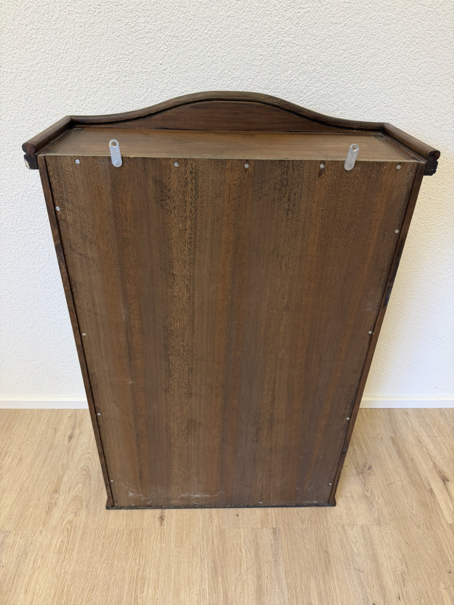 Ca. 1950er bis 1960er Jahre, gefertigt aus massivem Nussbaumholz und mit geschwungener Krone ausgeführt. Diese Vintage Wandvitrine bringt die warme, dunkle Ausstrahlung von echtem Nussbaum in den Raum. Die natürliche Maserung wirkt ruhig und hochwertig. Durch die grosse Glasfront und die verglasten Seiten kommen Porzellan, Gläser oder Sammlerstücke bestens zur Geltung. Die Wandmontage spart Stellfläche und eignet sich ideal für schmalere Räume oder über einem Sideboard.