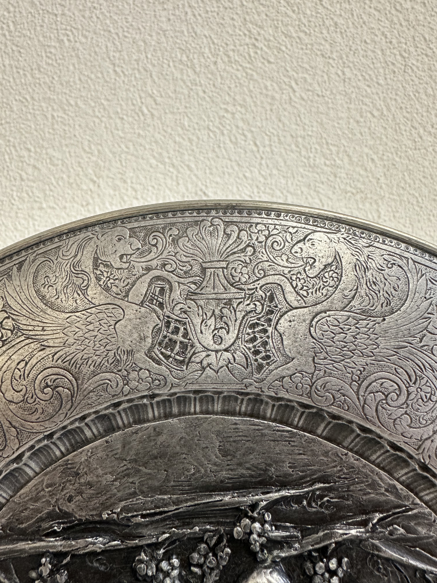 95 % Feinzinn, gestempelt Berndorf. Dieser runde Wandteller zeigt im Zentrum eine plastische Weinlese Szene mit zwei Figuren unter Reben. Körbe voller Trauben, fein ausgearbeitete Kleidung und ein reliefierter Hintergrund geben dem Motiv Tiefe und Leben. Der breite Rand ist reich graviert mit geschwungenen Ranken, floralen Mustern und heraldischen Elementen im barock inspirierten Stil.