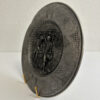Die dunklere Patina betont die Details und verleiht dem Teller eine schöne Tiefe. Auf der Rückseite ist ein stabiler Aufhängering angebracht, sodass er direkt an der Wand montiert werden kann.