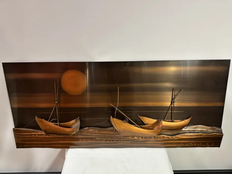 Wandbild 3D aus Kupfer mit Schiffen befindet sich in einem guten bis sehr guten Zustand. Dieses 3D Kupferbild ist mit drei wunderschönen Schiffen versehen. Wenn man das Bild so betrachtet, stahlt es eine unglaubliche Kraft und Ruhe aus. Das Kupfer macht das Bild sehr widerstandsfähig. Es ist gedacht zum aufhenken, kann aber auch an eine Wand / Möbelstück angelehnt werden.