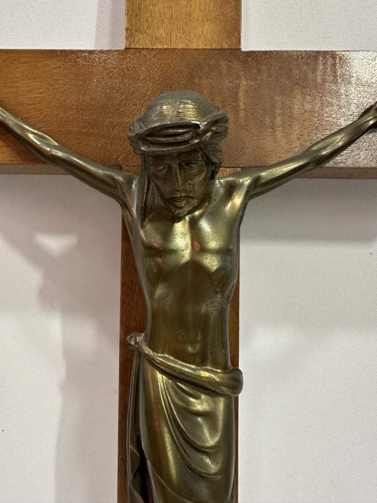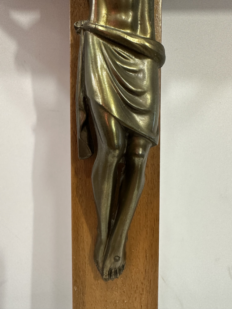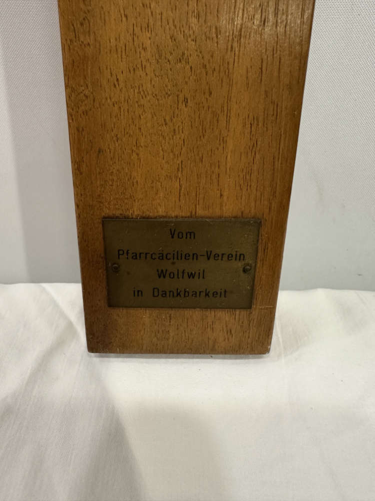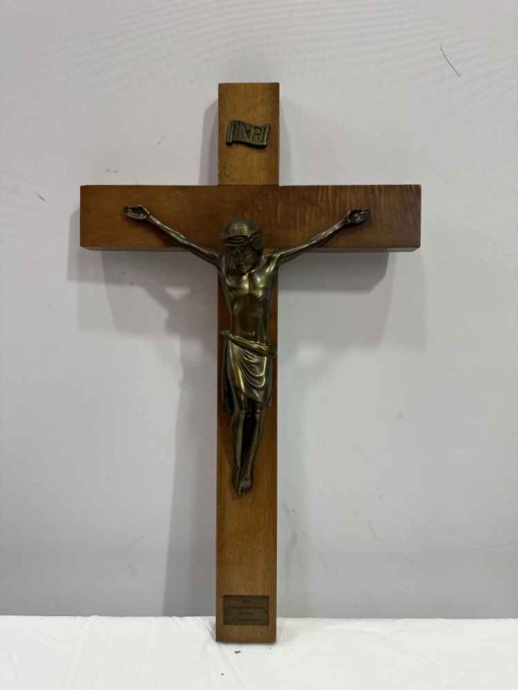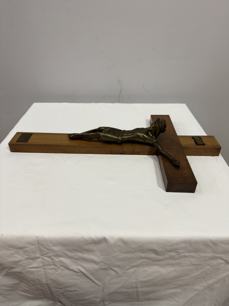 Dieses ausdrucksstarke Wandkreuz stammt vermutlich aus den 1960er Jahren und vereint klassische Handwerkskunst mit schlichter Würde. Der fein modellierte Korpus Christi ist aus patinierter Bronze gefertigt und auf einem massiven Holzkreuz befestigt. Über der Figur befindet sich die traditionelle INRI-Plakette, während eine Messingtafel am unteren Rand die Inschrift trägt: «Vom Pfarrcäcilien-Verein Wolfwil in Dankbarkeit».