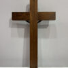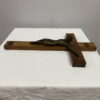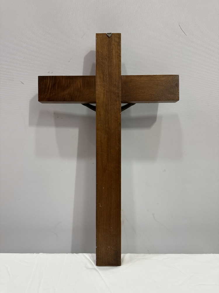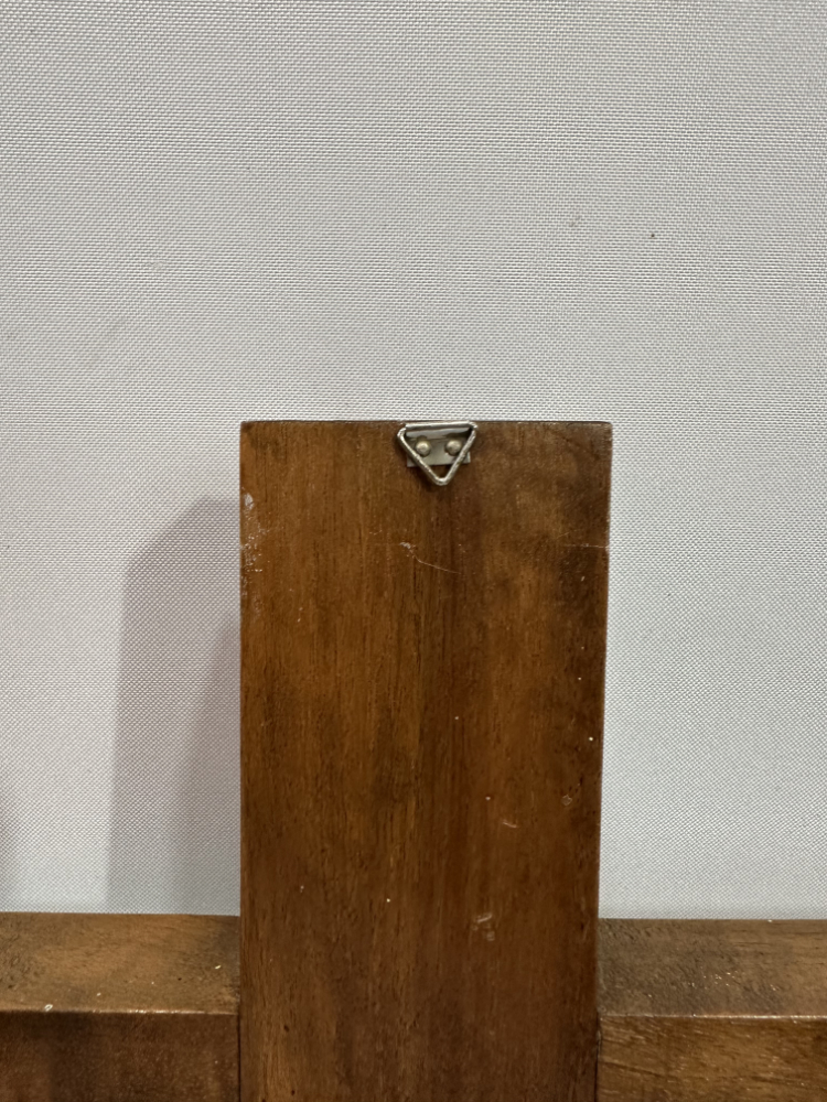 Das Kreuz spiegelt den Stil kirchlicher Nachkriegszeit wider, klar, ehrfürchtig und von Hand gefertigt. Auf der Rückseite befindet sich eine stabile Aufhängevorrichtung. Ideal für Sakralräume, Kapellen oder als spirituelles Erinnerungsstück.