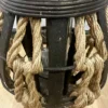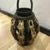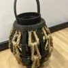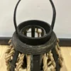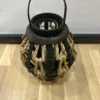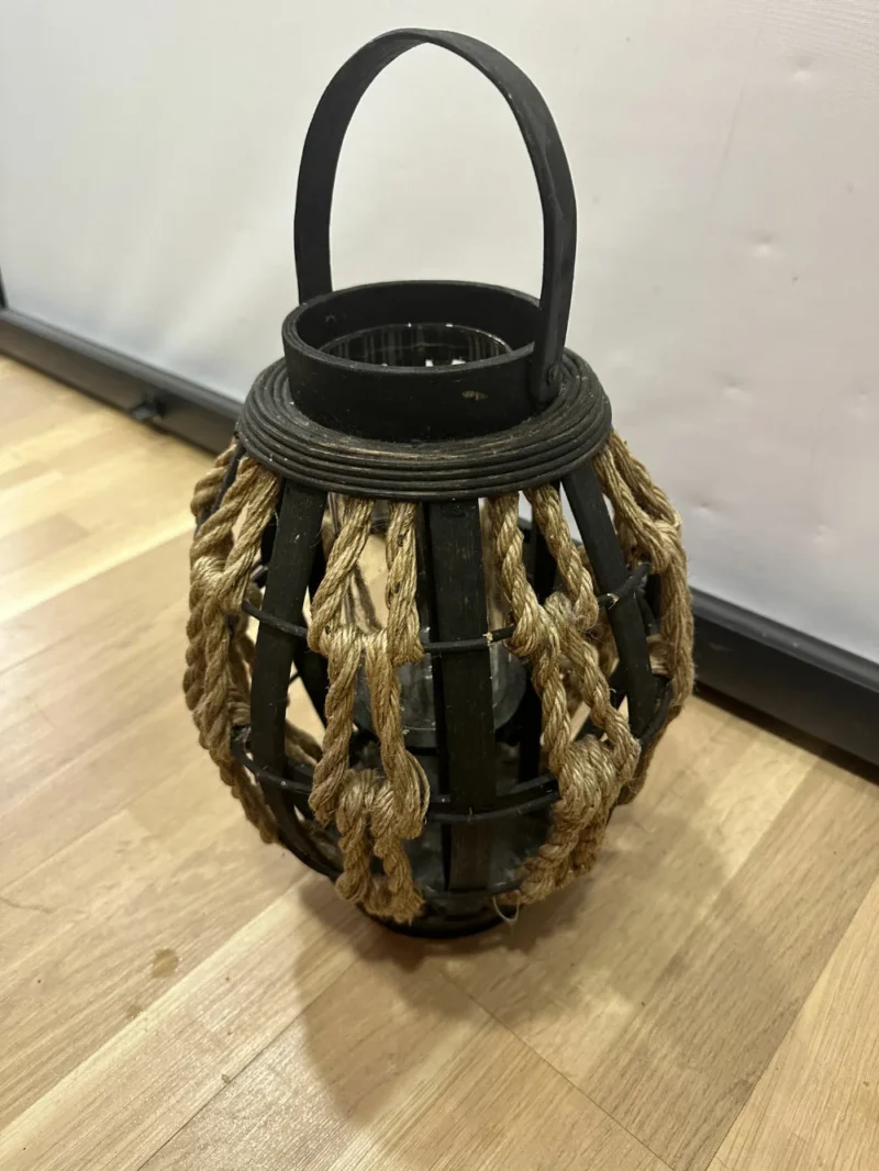 Windlicht/ Laterne mit Glaseinsatz befindet sich in einem guten bis sehr guten Zustand. Dieses Windlicht hat eine tolle Optik, die durch ein schwarzes Gehäuse versehen wird, zwischen durch spannen sich Schnüre und bilden eine tolle Verzierung. Im inneren hat es noch ein Glaseinsatz, dahinein kann man z.b eine Kerze stellen, wie auch einen Blumenstrauss. Es ist sowohl im Innenbereich gedacht, wie auch draussen.