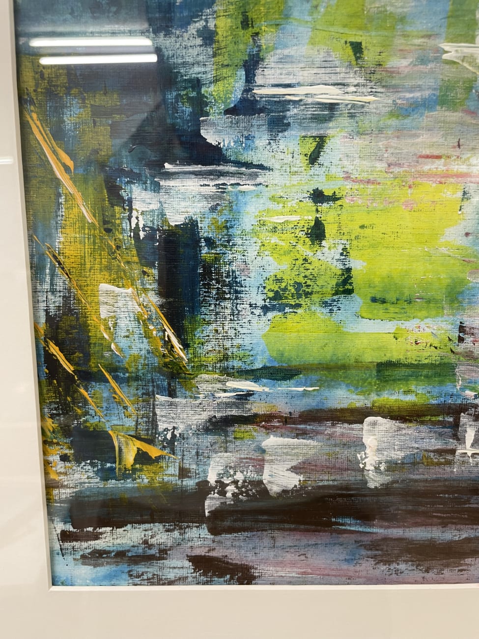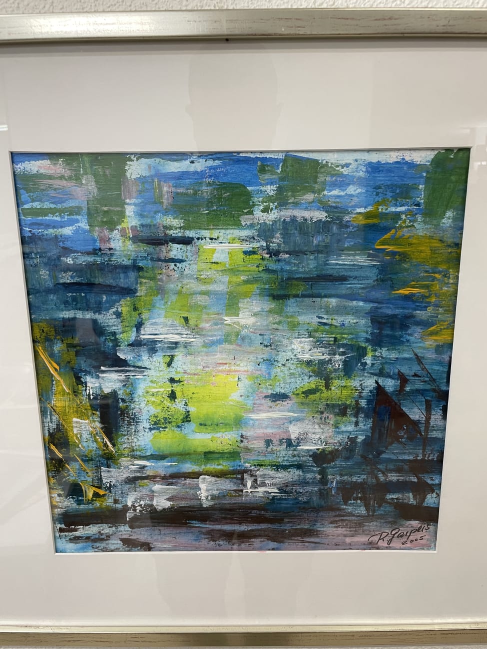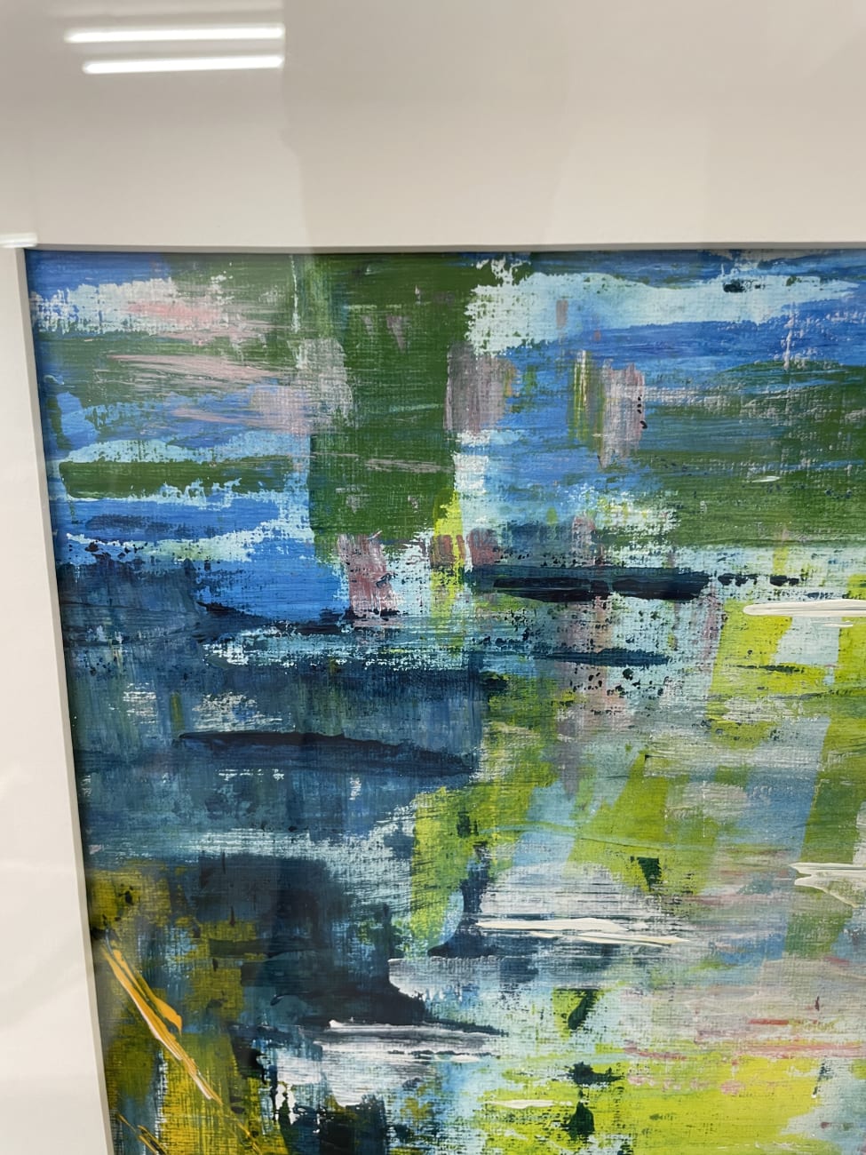 Kräftige Farbflächen in Blau, Grün, Gelb und Weiss prägen dieses moderne Kunstwerk aus dem Jahr 2005. Mehrere Farbschichten, Spachtelspuren und dynamische Pinselbewegungen sorgen für eine lebendige Oberfläche mit viel Tiefe. Die Komposition erinnert an Wasser, Lichtreflexe oder eine abstrakte Landschaft und bleibt bewusst offen für eigene Interpretation. Unten rechts signiert R. Gaspers 2005. Präsentiert in einem silberfarbenen Rahmen mit Passepartout und Glas.