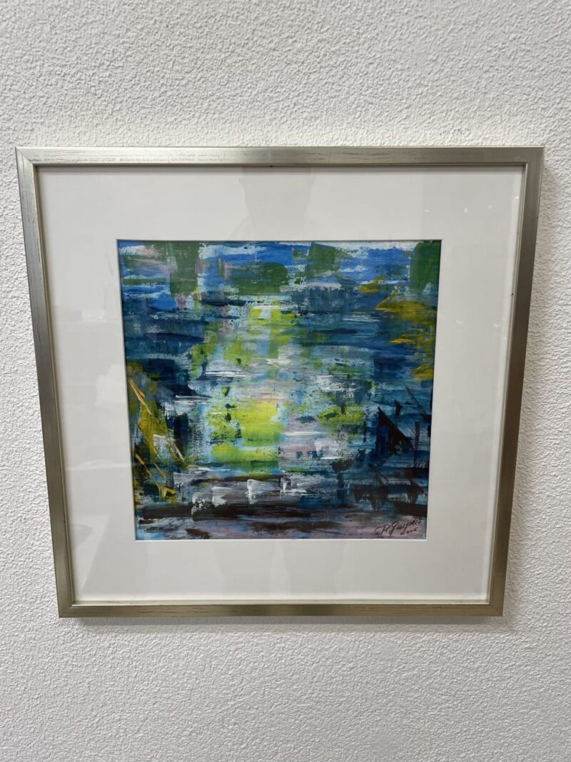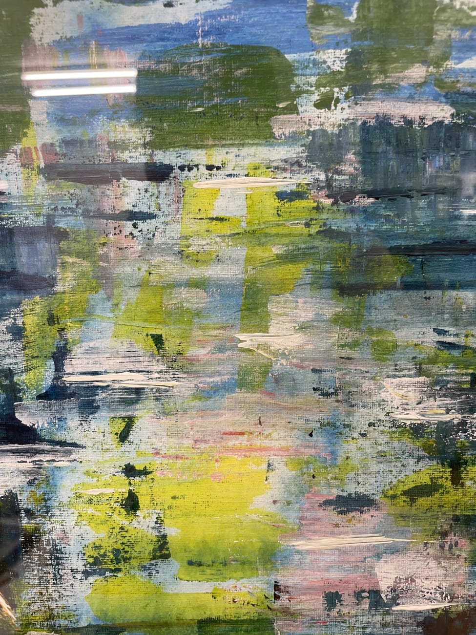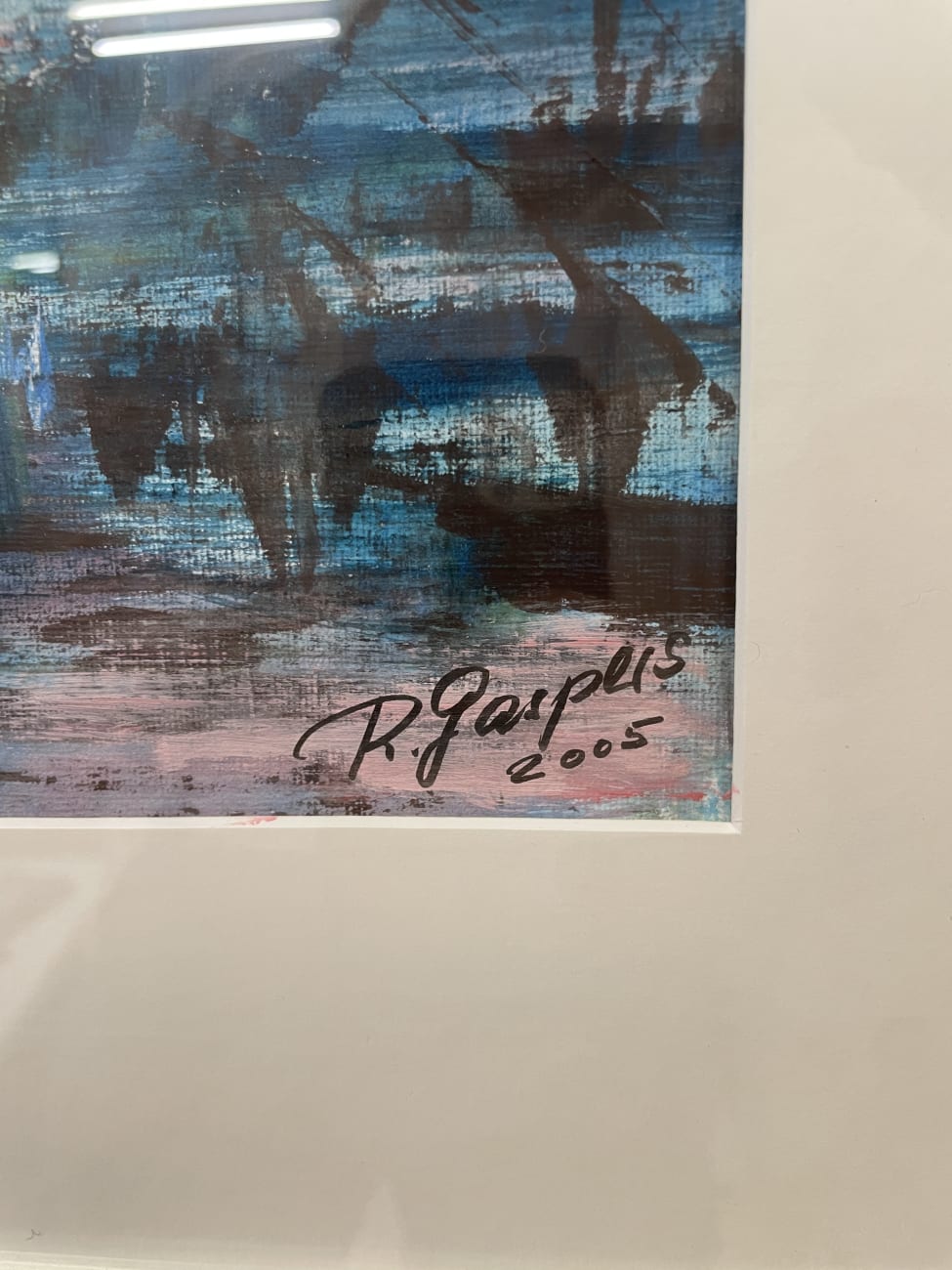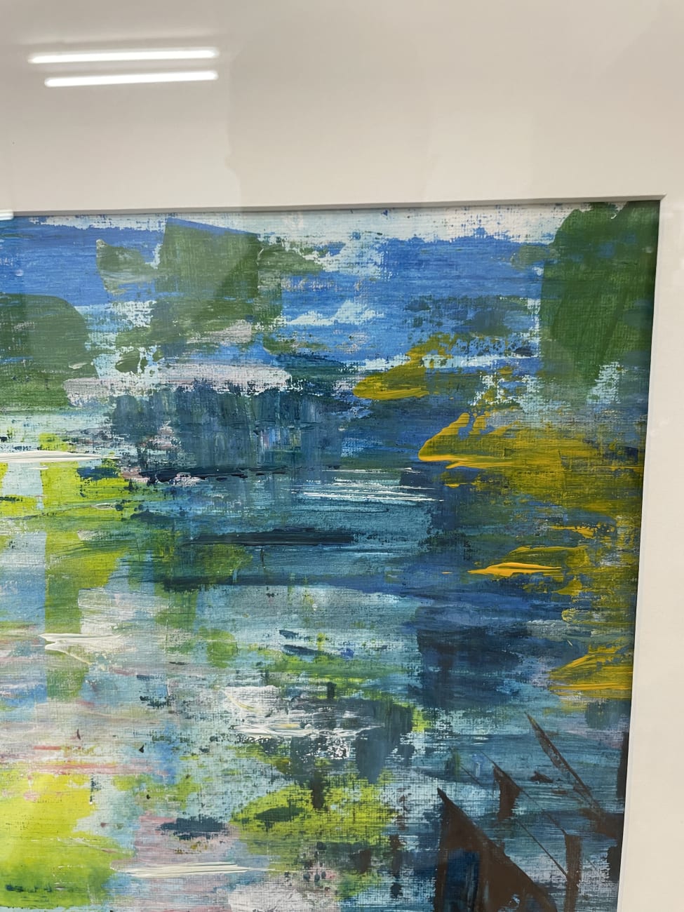 Kräftige Farbflächen in Blau, Grün, Gelb und Weiss prägen dieses moderne Kunstwerk aus dem Jahr 2005. Mehrere Farbschichten, Spachtelspuren und dynamische Pinselbewegungen sorgen für eine lebendige Oberfläche mit viel Tiefe. Die Komposition erinnert an Wasser, Lichtreflexe oder eine abstrakte Landschaft und bleibt bewusst offen für eigene Interpretation. Unten rechts signiert R. Gaspers 2005. Präsentiert in einem silberfarbenen Rahmen mit Passepartout und Glas.