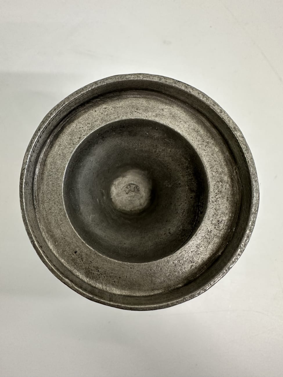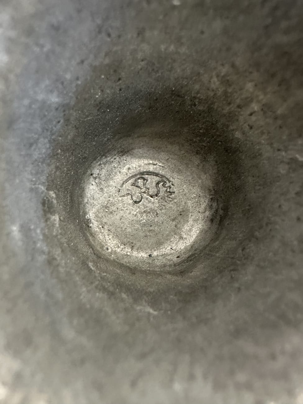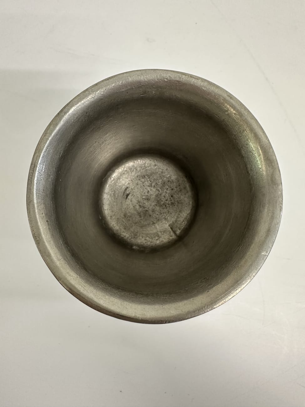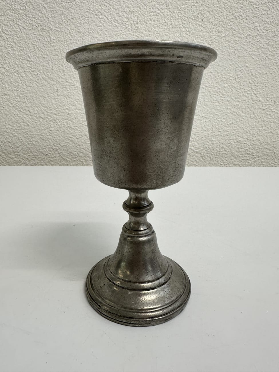 Kompakte Form, solide verarbeitet und angenehm in der Hand. Das matte Zinn zeigt eine ruhige, leicht gealterte Oberfläche und wirkt auf dem Tisch schlicht und stimmig. Jeder Becher steht stabil auf einem breiten Fuss. Innen sowie am Boden ist eine Prägung sichtbar, was auf echtes Zinn hinweist.