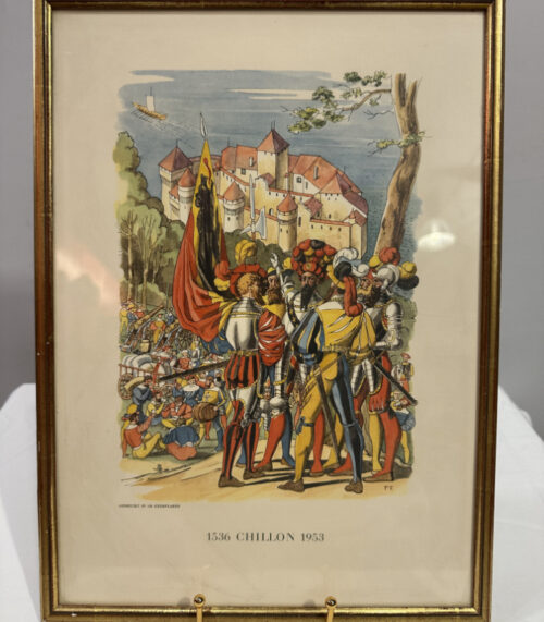 Limitierte Lithografie Eroberung Schloss Chillon „1536 Chillon 1953“ von P. Favre