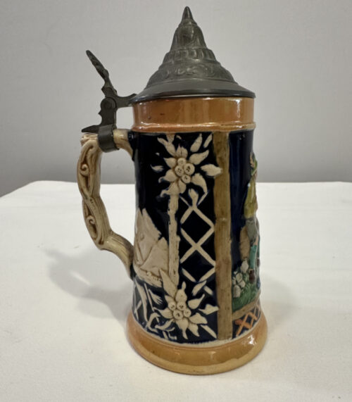 Traditioneller Bierkrug mit Zinndeckel – Handbemalt, Reliefszene, RM Germany 3593