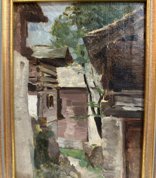 Ölgemälde mit Holzhäusern im dörflichen Stil – mit schönem Goldrahmen 28 x 36 cm